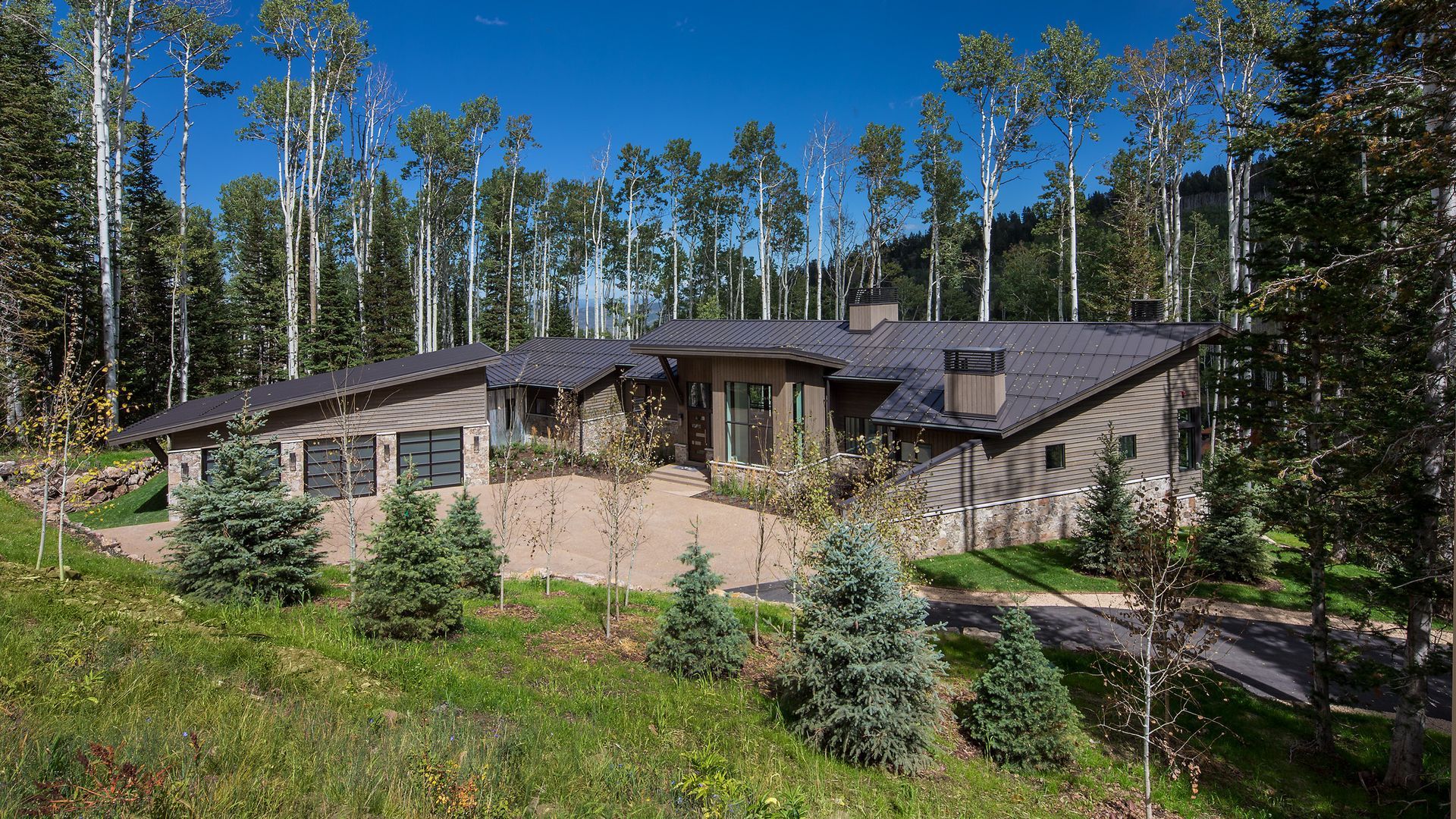 This hilltop home in the Colony is a surprising mountain modern home with a soaring roof line perfect for views of the surrounding ski resort. Horizontal shiplap siding softens the architecture and visually links the home to the property’s grade. Exterior stone, visually eased with lichen and moss, anchors the dwelling and visually organizes its sections. Corrugated metal serves as an aesthetic connector between the garage and main house, and sculpture-like wood-framed columns encase metal railings.