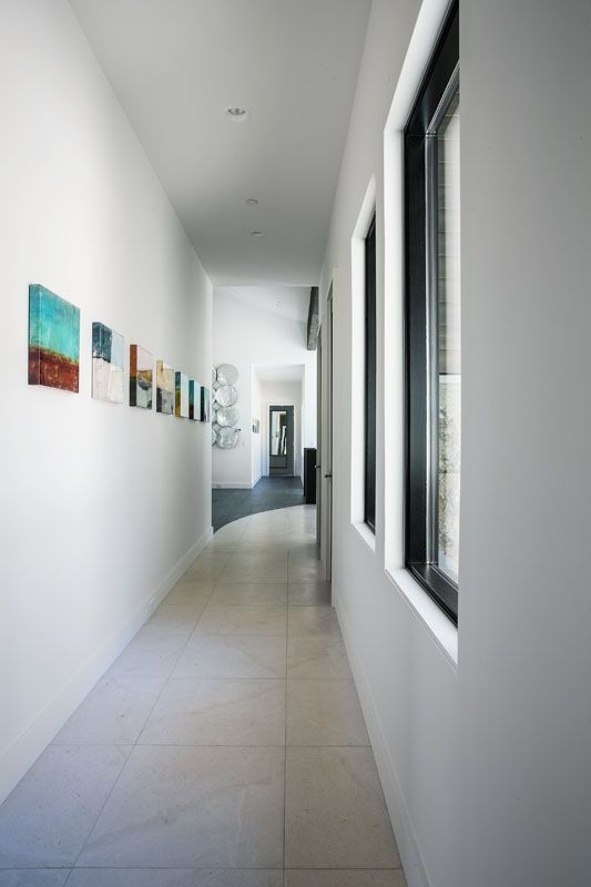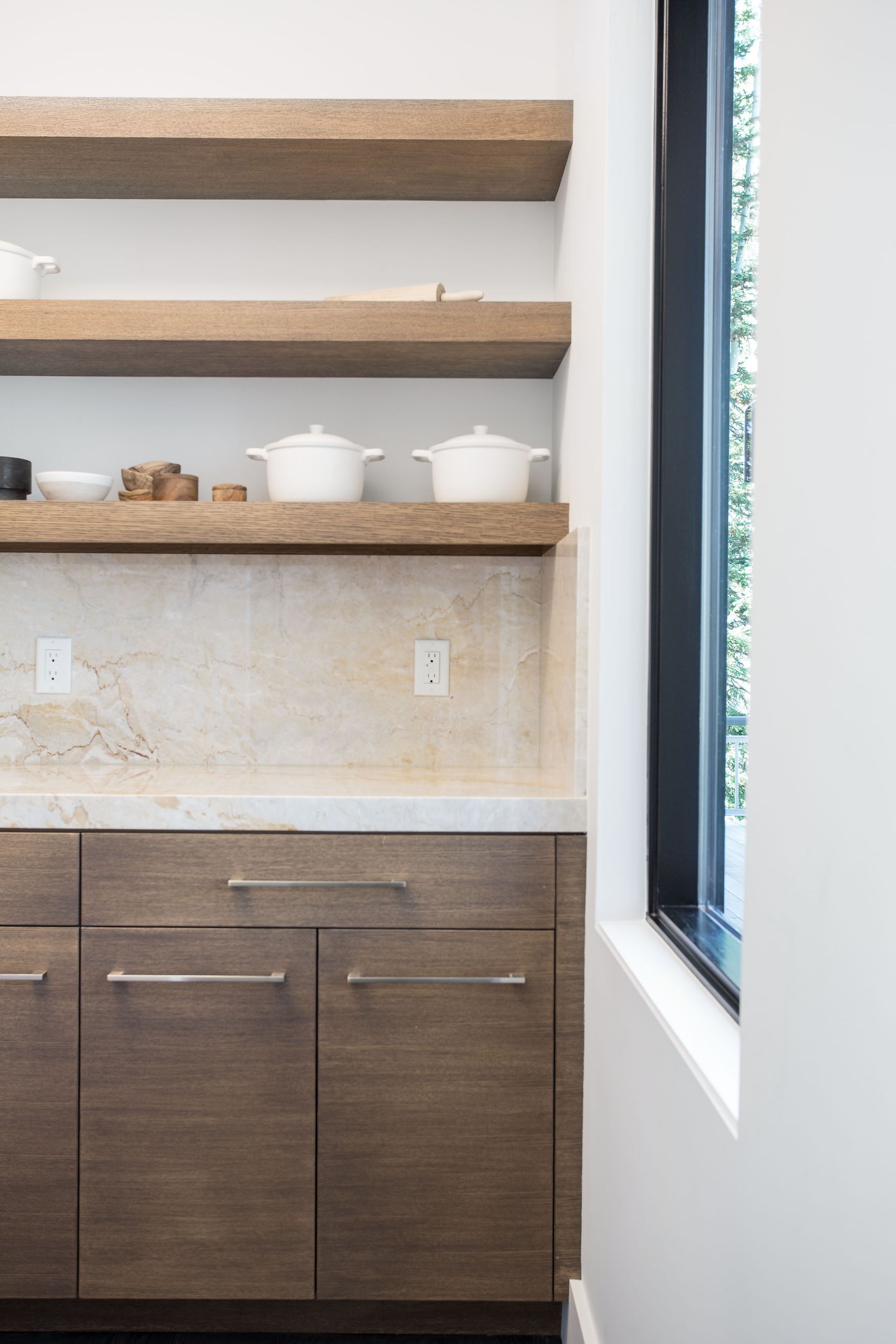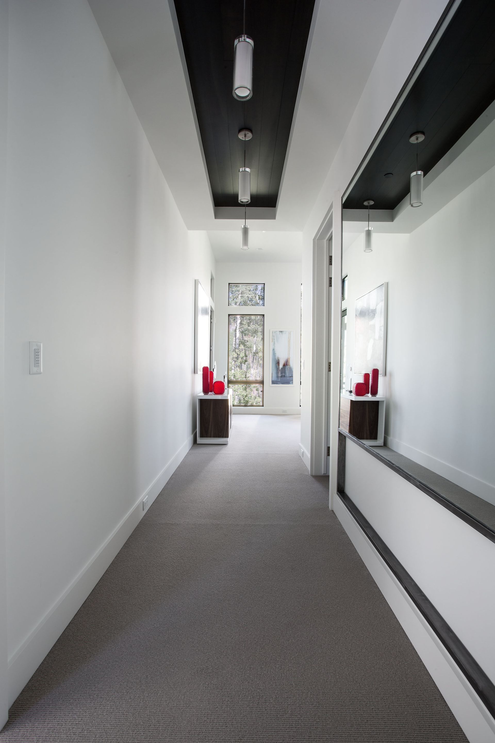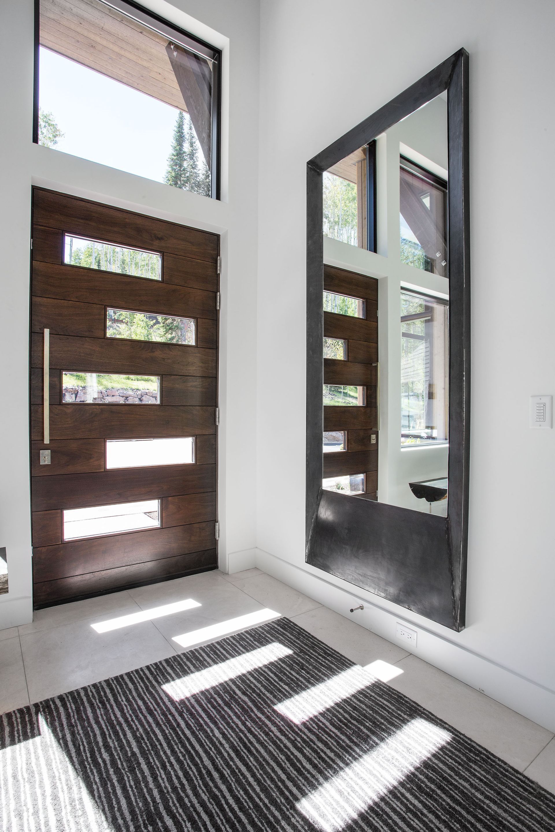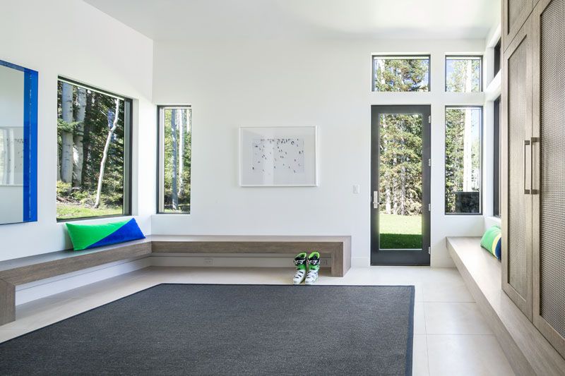 The light-filled entry ousts any thoughts that this may be a typical mountain home. A contemporary composition of untrimmed windows and a single door inset with horizontal glass panes opens to a space performing less as a foyer than as a vantage point where guests catch first sight of the mountain views filling the great room beyond.