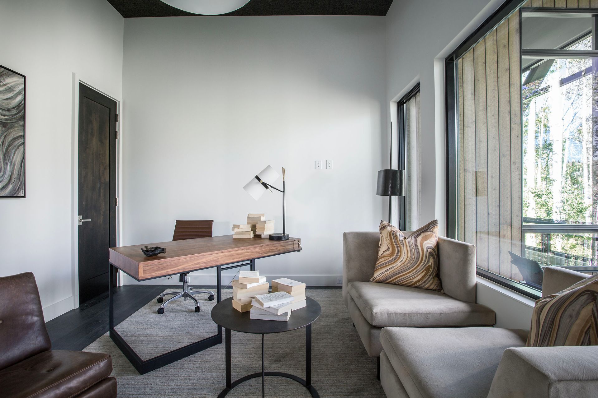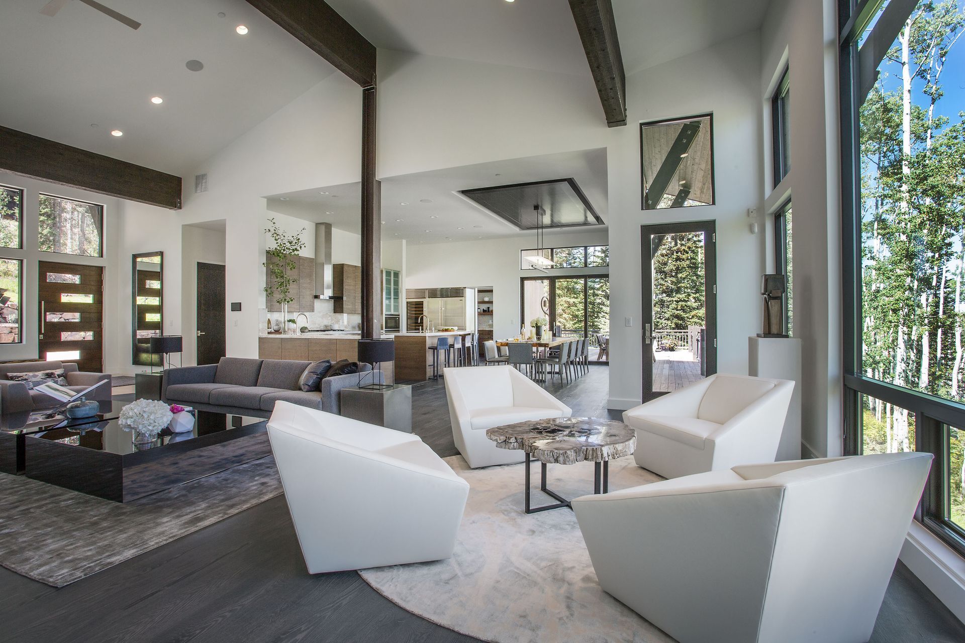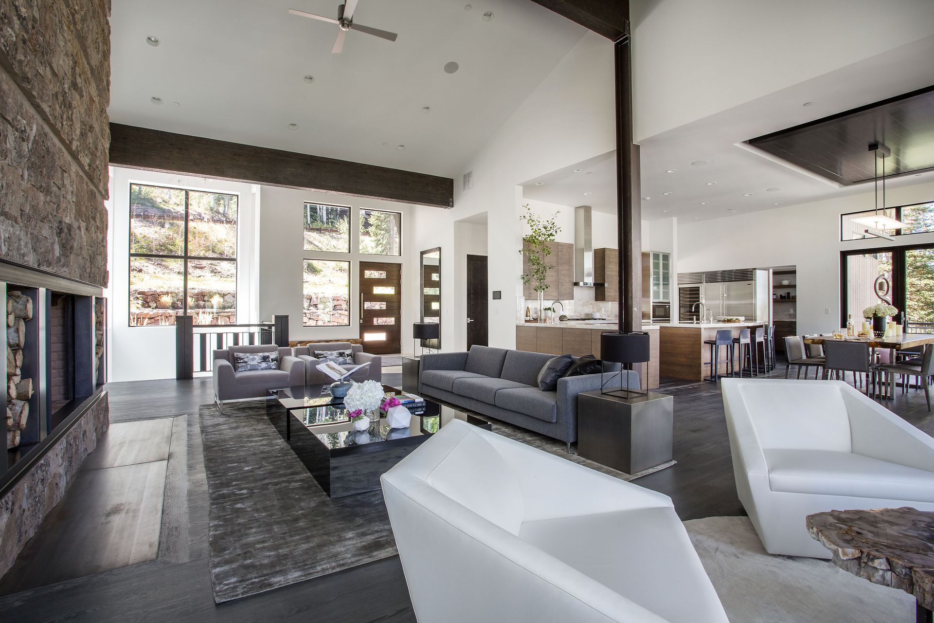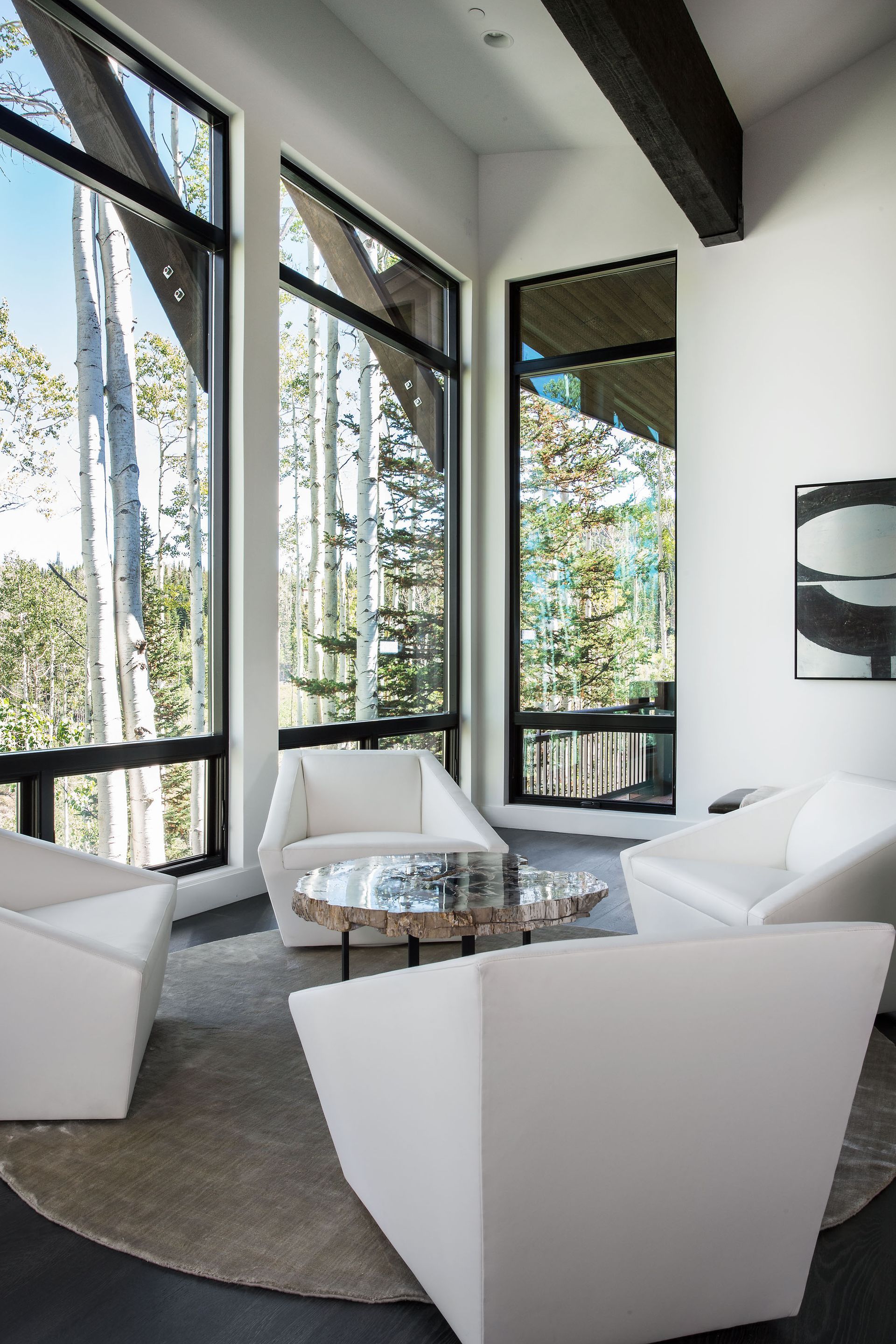Exterior colors mimic those of the surrounding aspen bark and scrub oak to help nestle the house into its site. To fully capture the million-dollar panorama, the exterior decks were positioned at the end of the home rather than the center so as not to interrupt the view. A narrow palette of materials and colors unifies interior spaces and defines the décor. The design team juxtaposed dark, wire-brushed oak floors with smooth, white walls and painted the window frames black to replicate steel and coincide with the stone clad fireplaces.