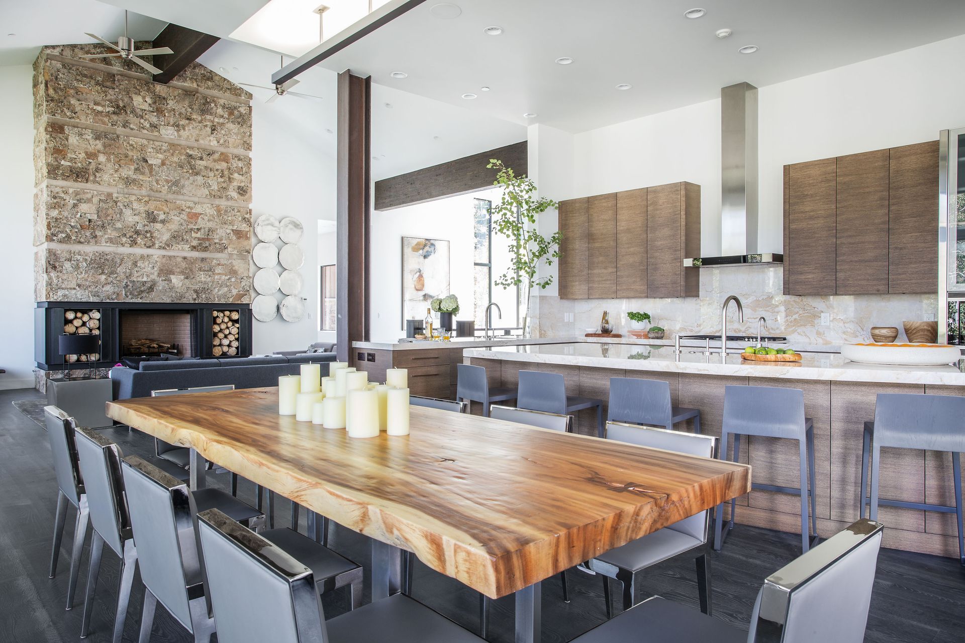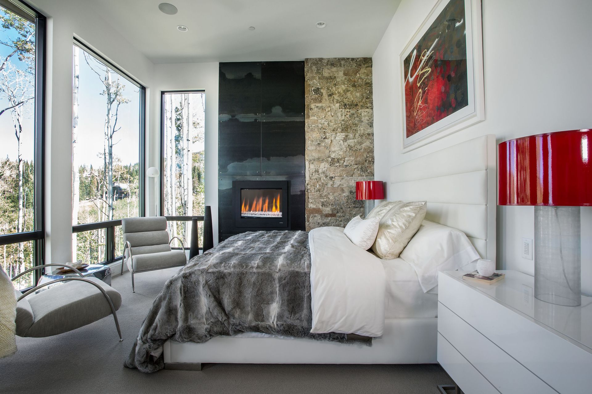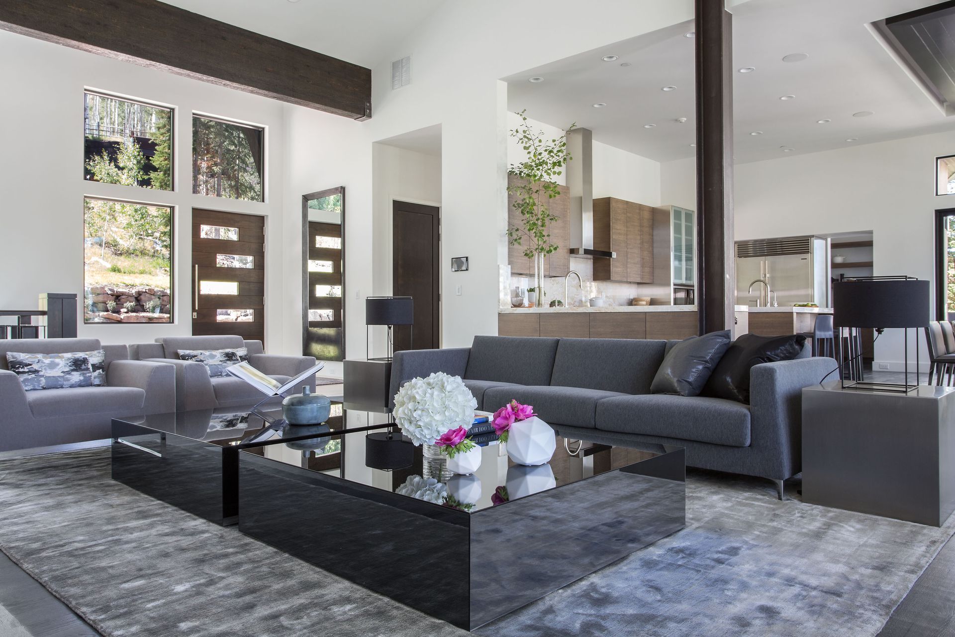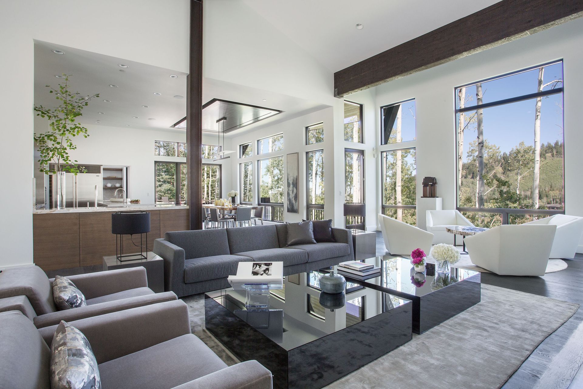Exterior colors mimic those of the surrounding aspen bark and scrub oak to help nestle the house into its site. To fully capture the million-dollar panorama, the exterior decks were positioned at the end of the home rather than the center so as not to interrupt the view. A narrow palette of materials and colors unifies interior spaces and defines the décor. The design team juxtaposed dark, wire-brushed oak floors with smooth, white walls and painted the window frames black to replicate steel and coincide with the stone clad fireplaces.
