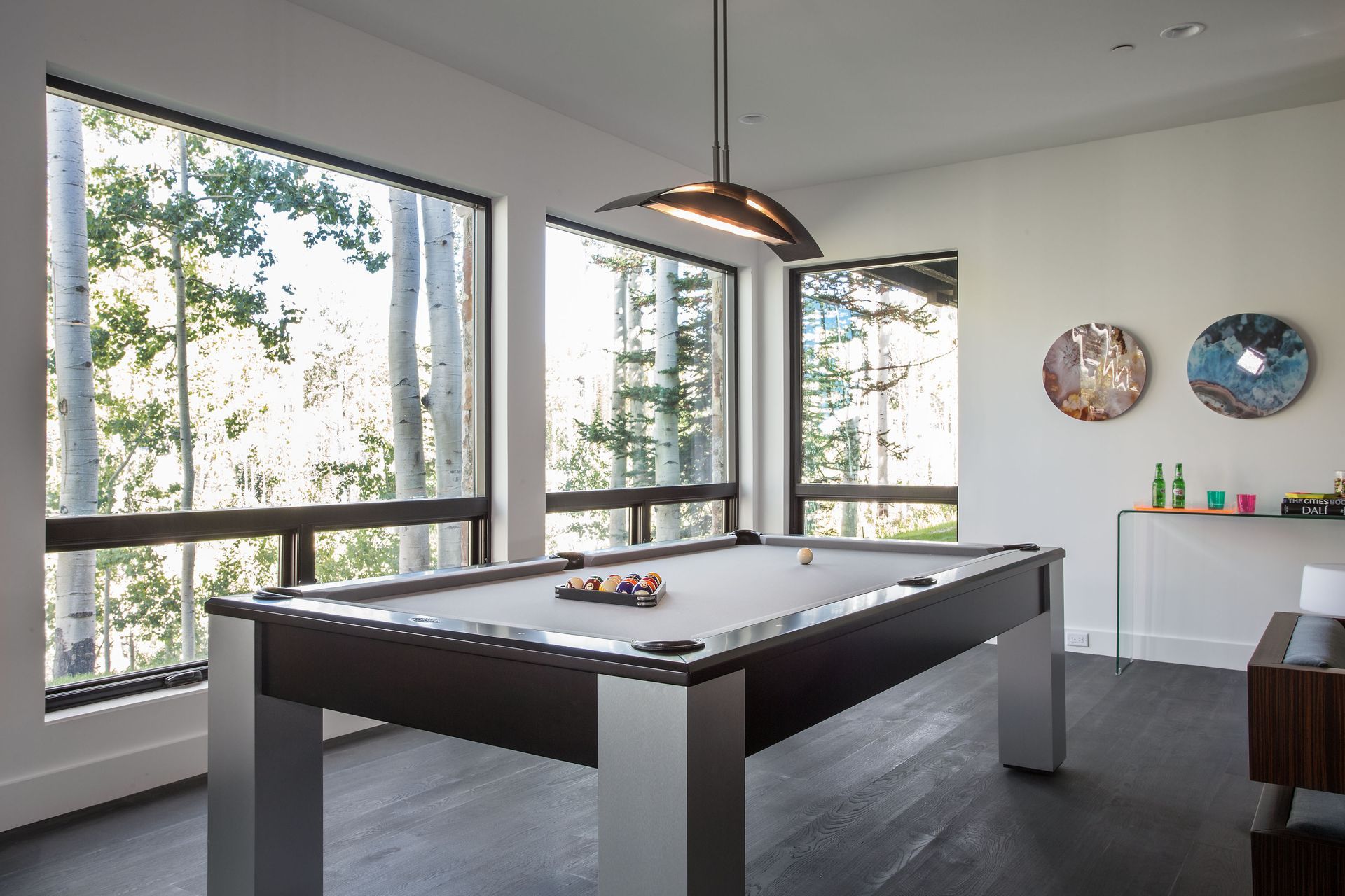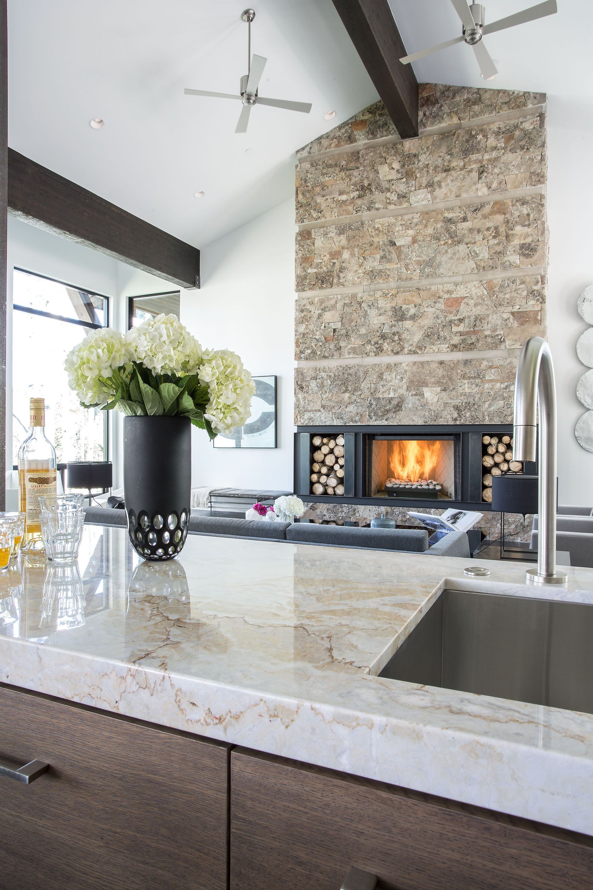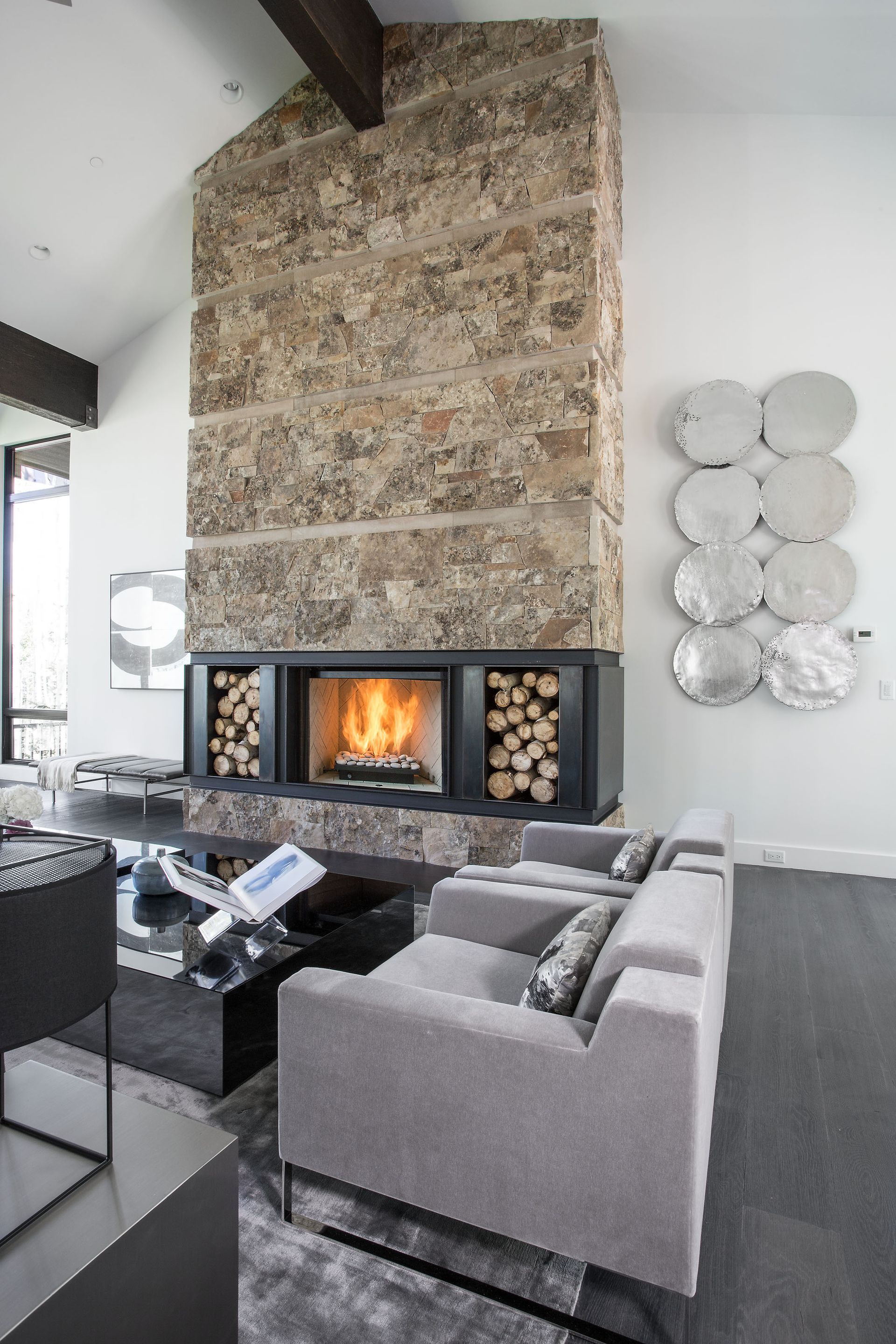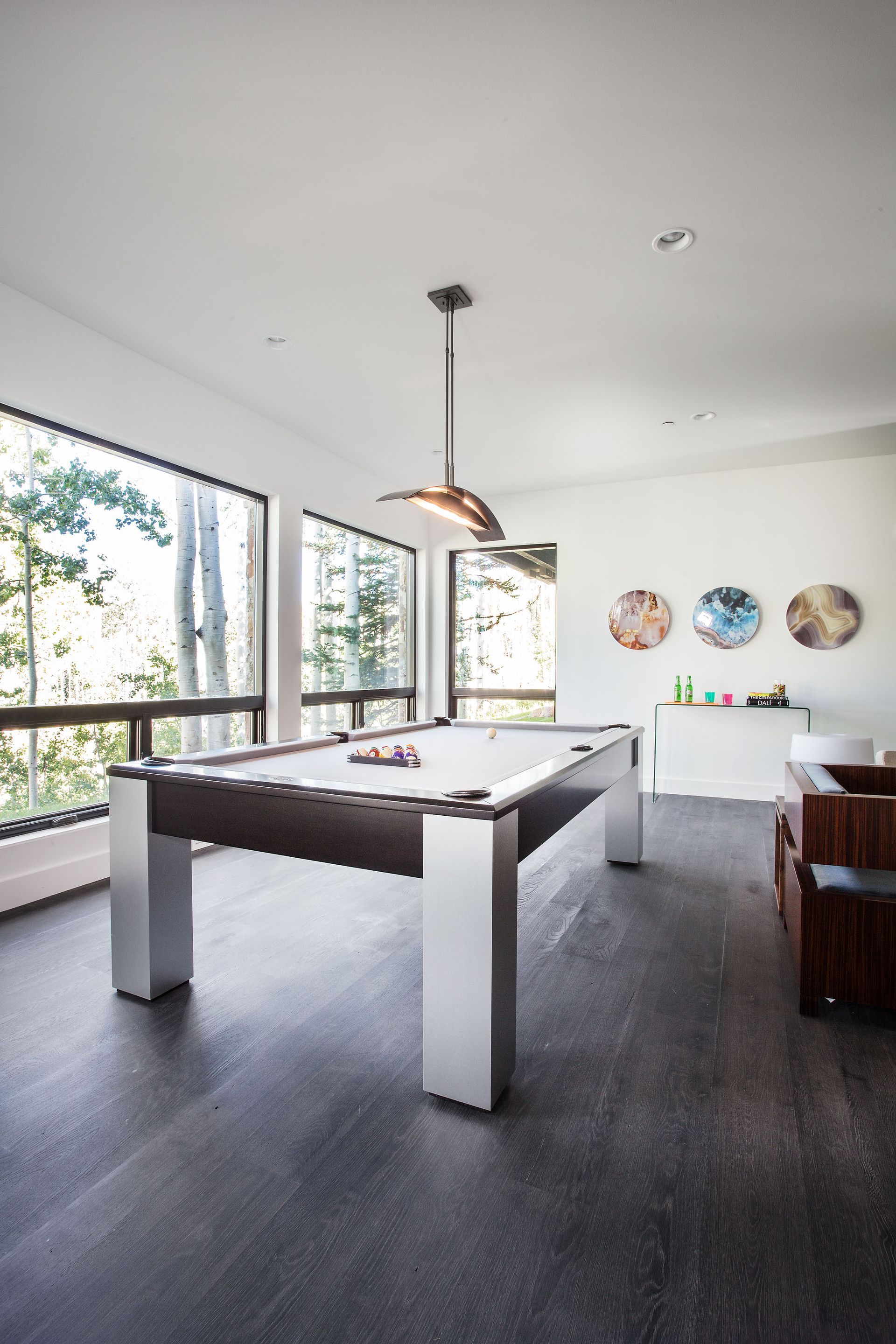 Exterior colors mimic those of the surrounding aspen bark and scrub oak to help nestle the house into its site. To fully capture the million-dollar panorama, the exterior decks were positioned at the end of the home rather than the center so as not to interrupt the view. A narrow palette of materials and colors unifies interior spaces and defines the décor. The design team juxtaposed dark, wire-brushed oak floors with smooth, white walls and painted the window frames black to replicate steel and coincide with the stone clad fireplaces.