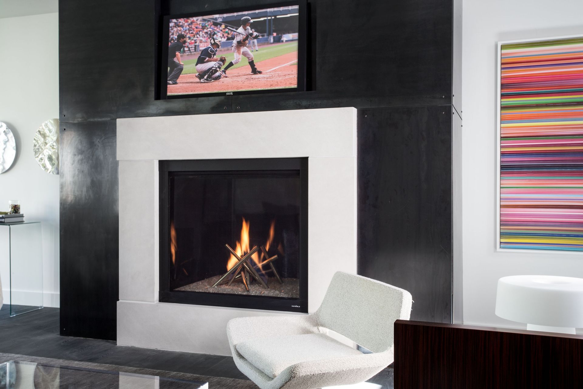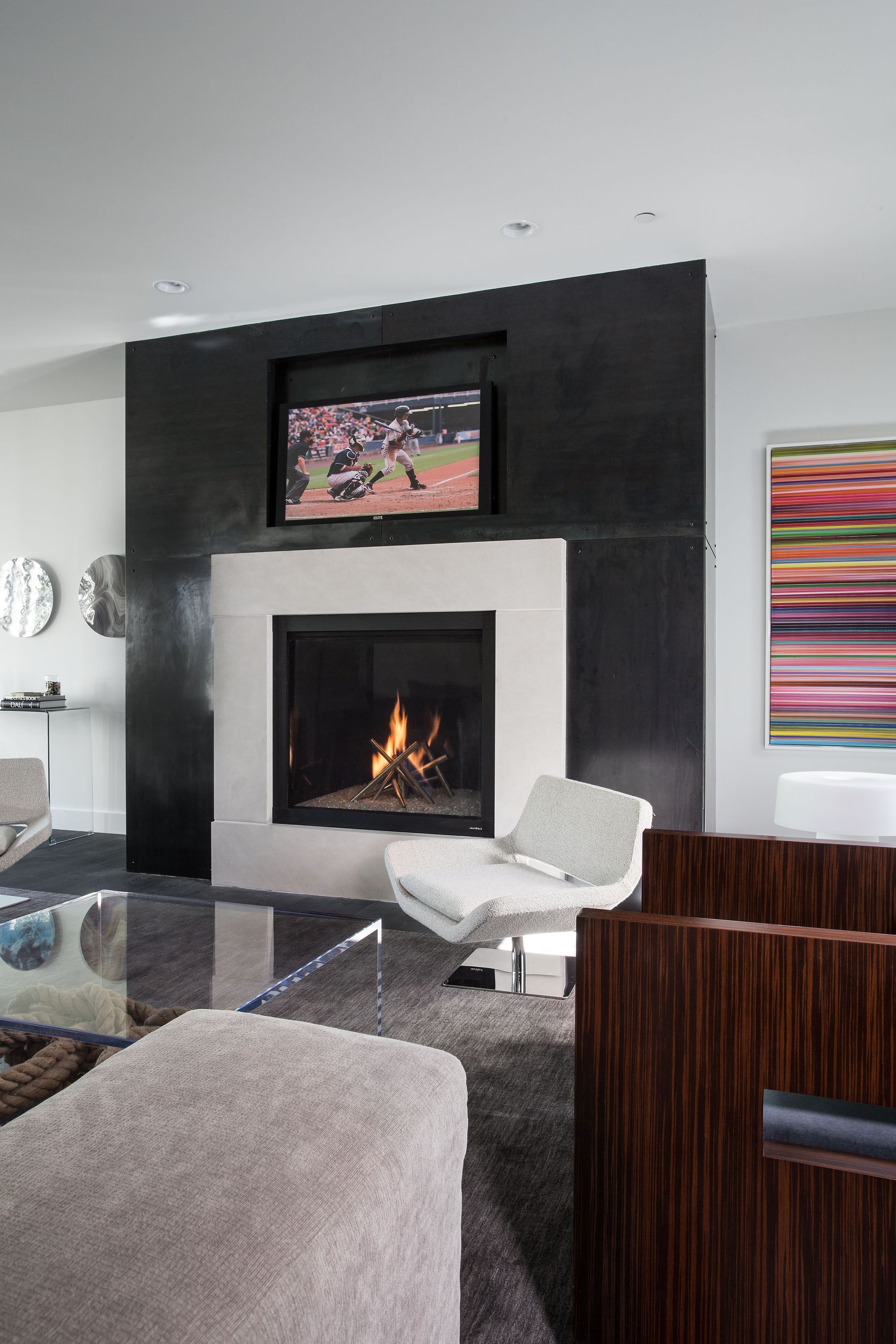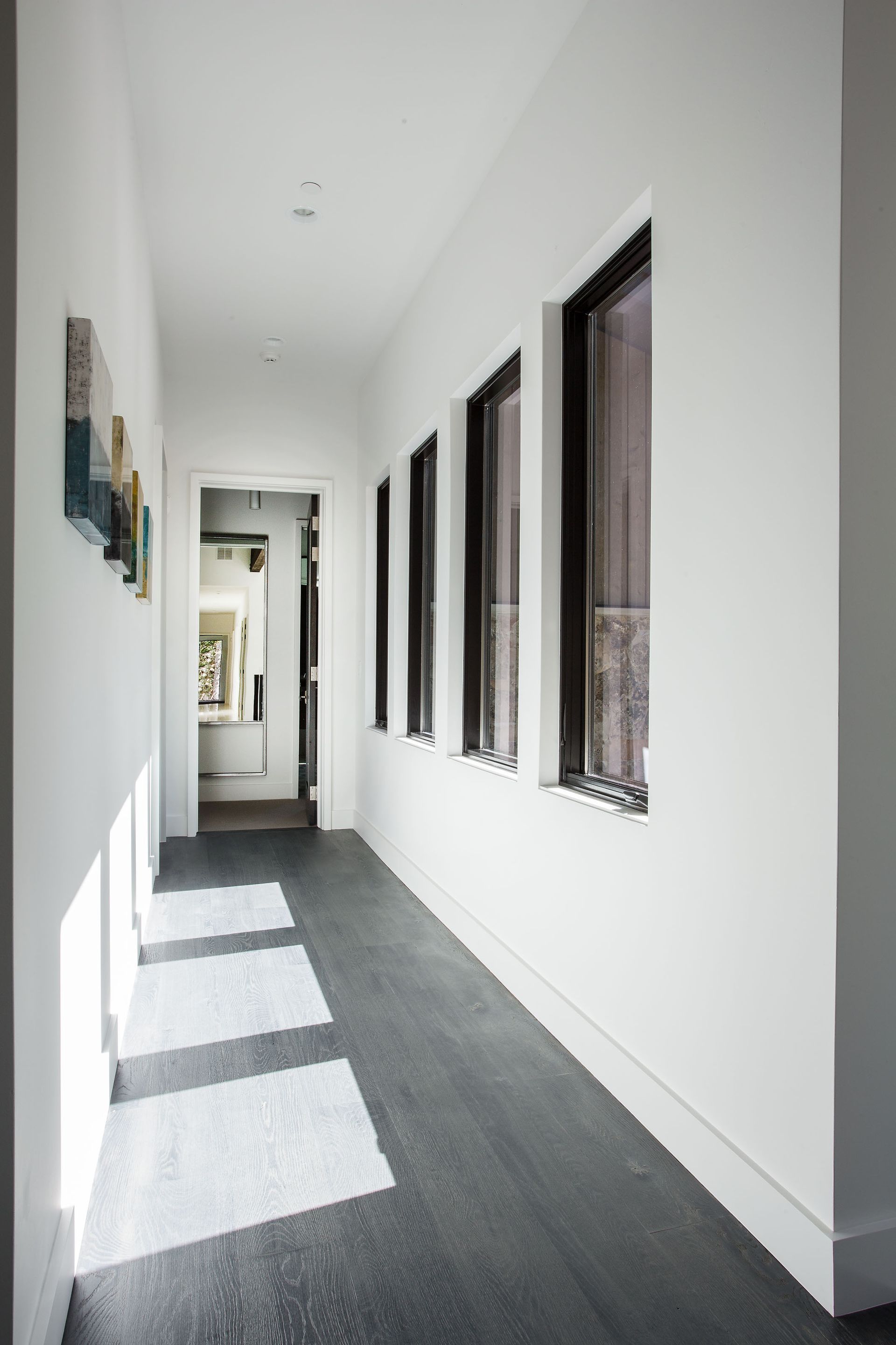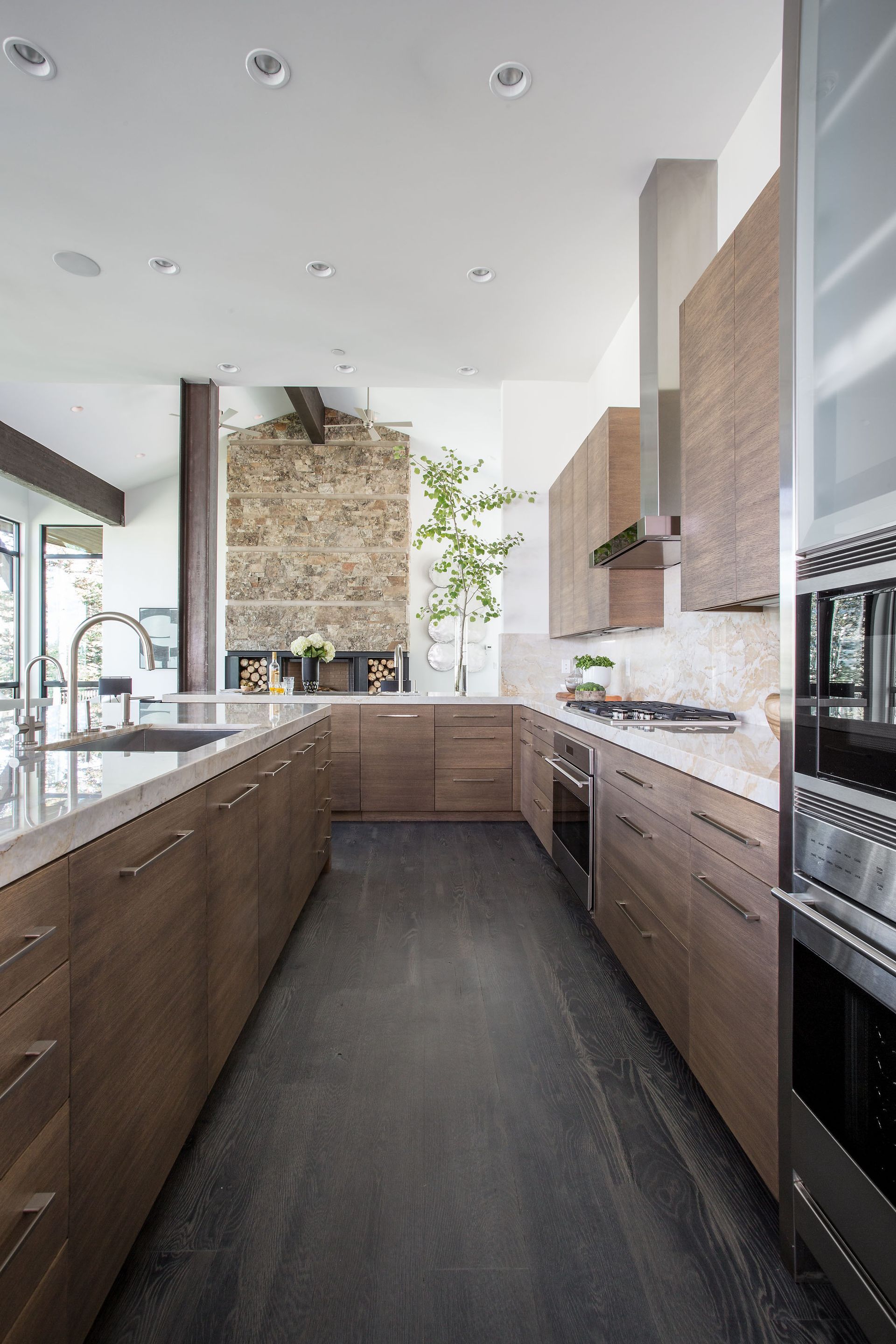 Exterior colors mimic those of the surrounding aspen bark and scrub oak to help nestle the house into its site. To fully capture the million-dollar panorama, the exterior decks were positioned at the end of the home rather than the center so as not to interrupt the view. A narrow palette of materials and colors unifies interior spaces and defines the décor. The design team juxtaposed dark, wire-brushed oak floors with smooth, white walls and painted the window frames black to replicate steel and coincide with the stone clad fireplaces.