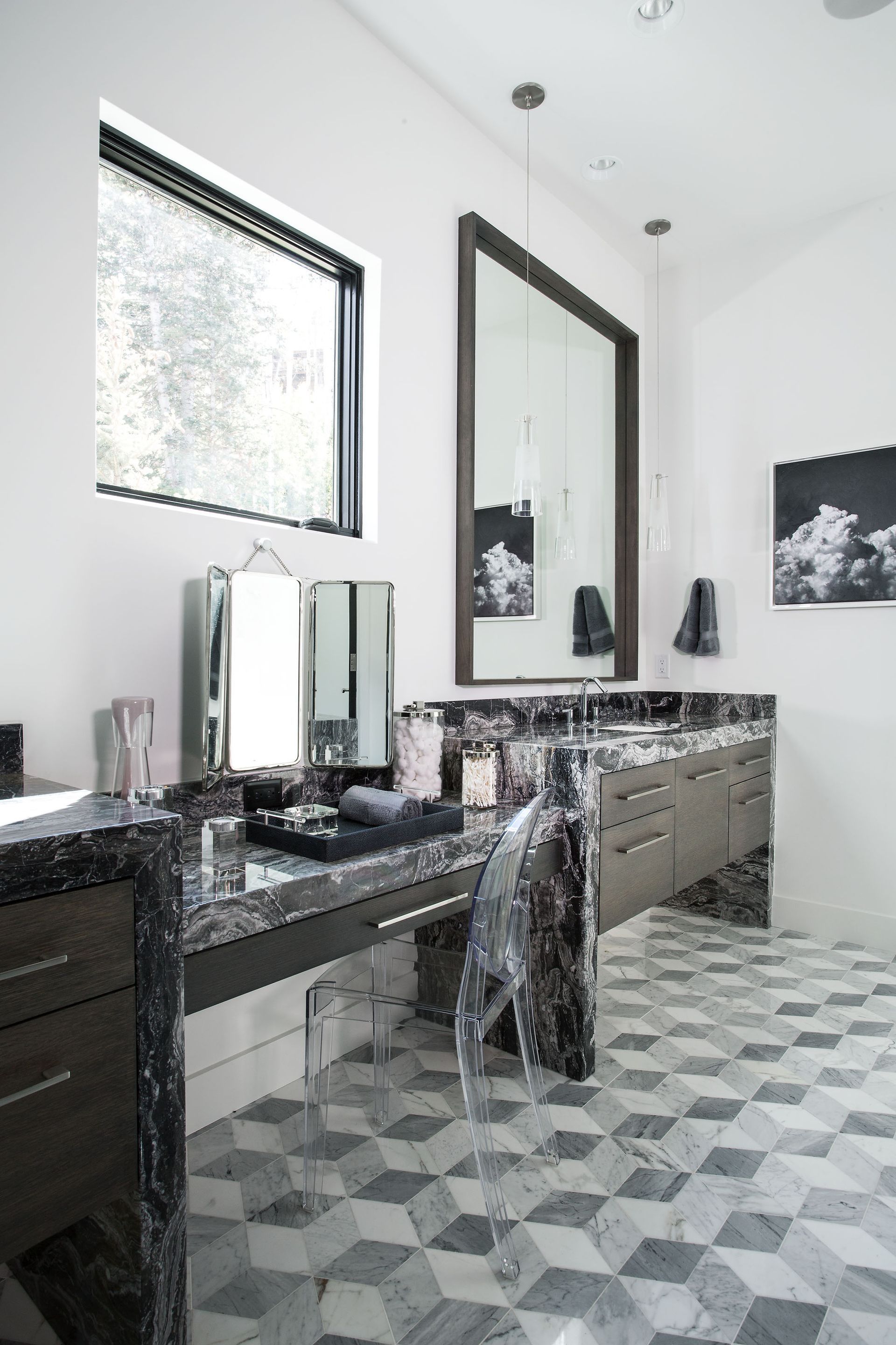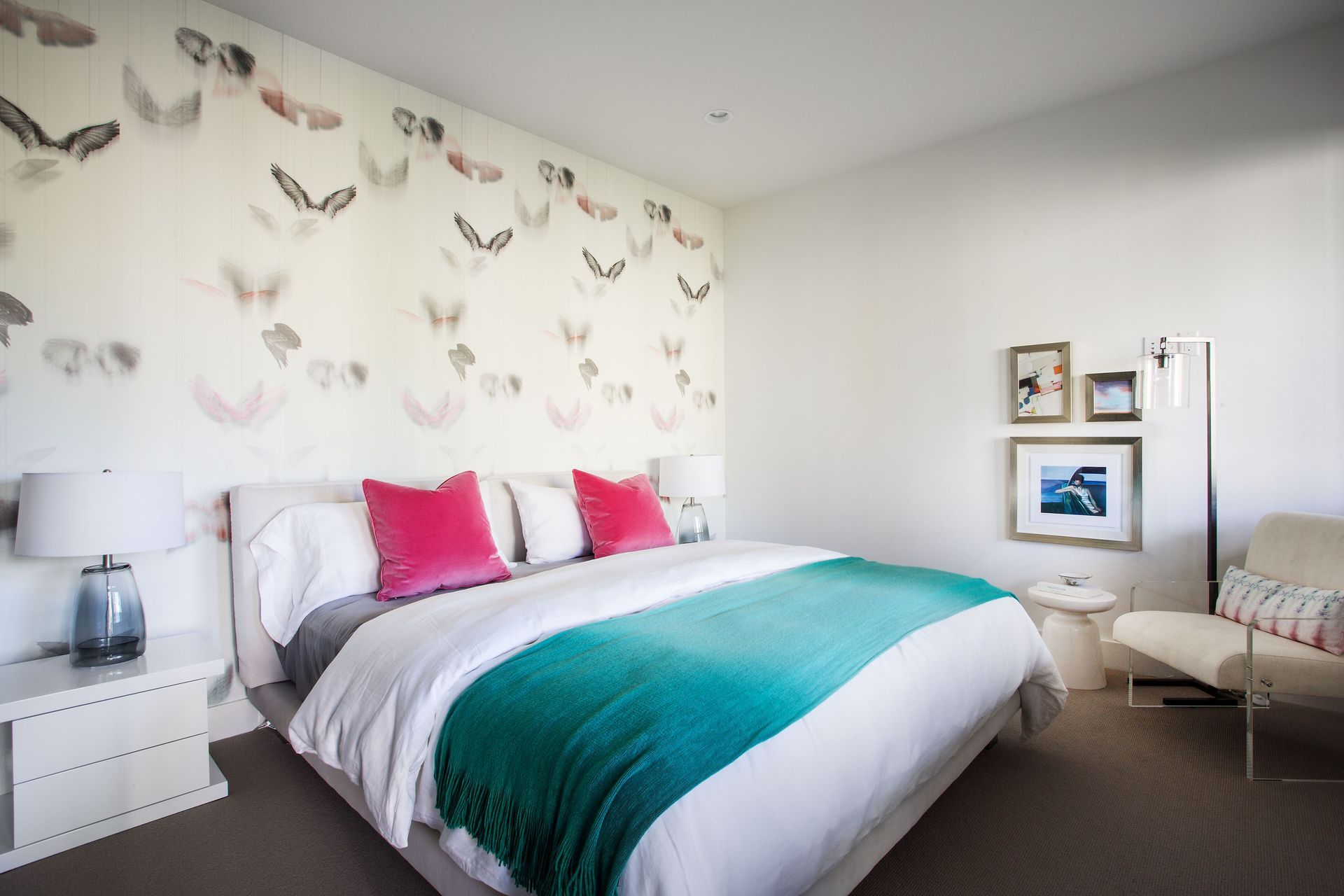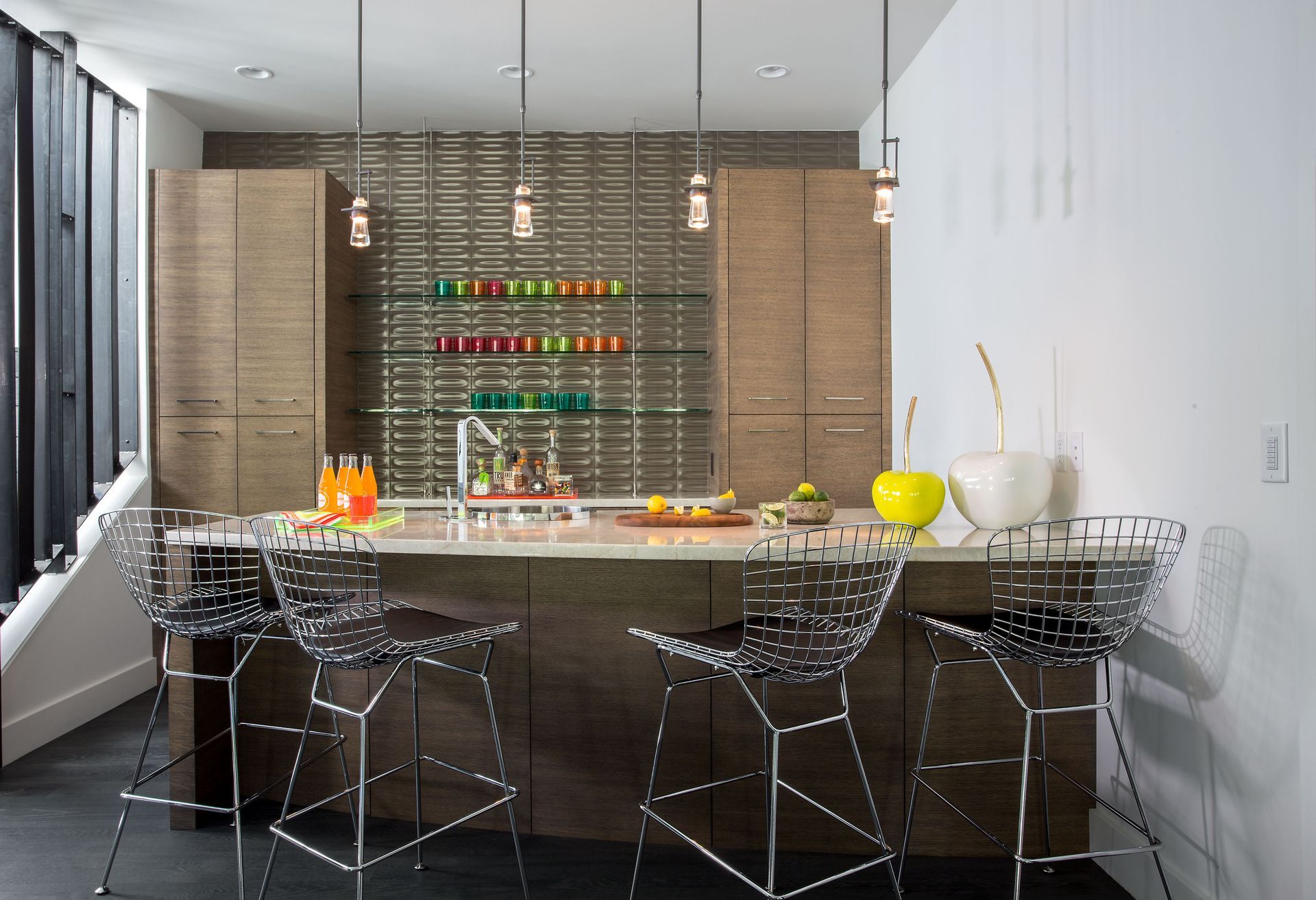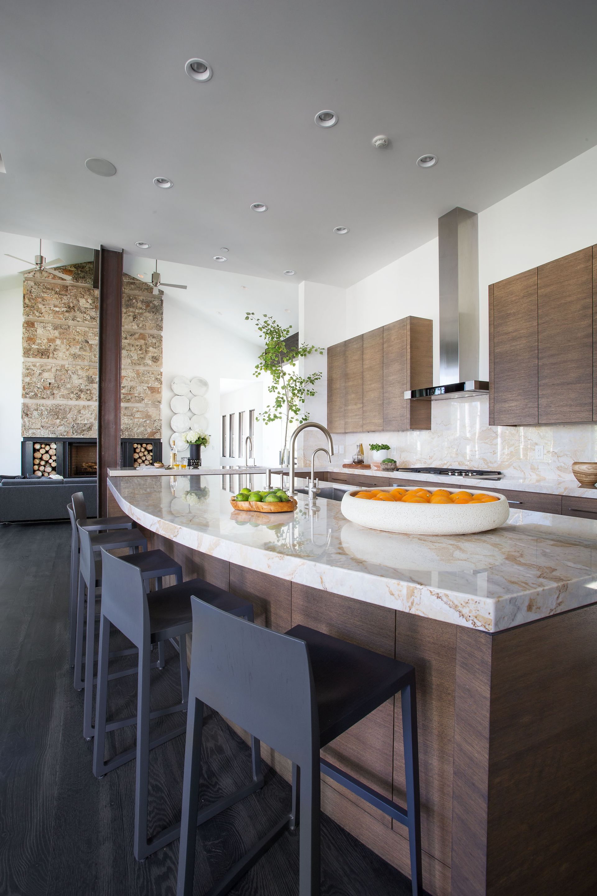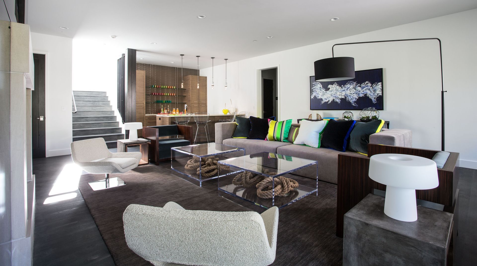 In the wide-open great room multiple sitting areas boost the living area’s functionality. A wet bar, pantry and working area merge in the nearby kitchen and a curved, single-level island performs double duty as a counter and breakfast bar for the kitchen and the dining areas. A mix of fabrics and low-profile furnishings compose a space that delineates the open space without detracting from the views. The clean-lined forms and the contrasting colors curated a space that interplays with light and dark, a dialogue that is compelling and interesting with shots of bold color, organic materials, sparkling Lucite and spirited wallpaper.