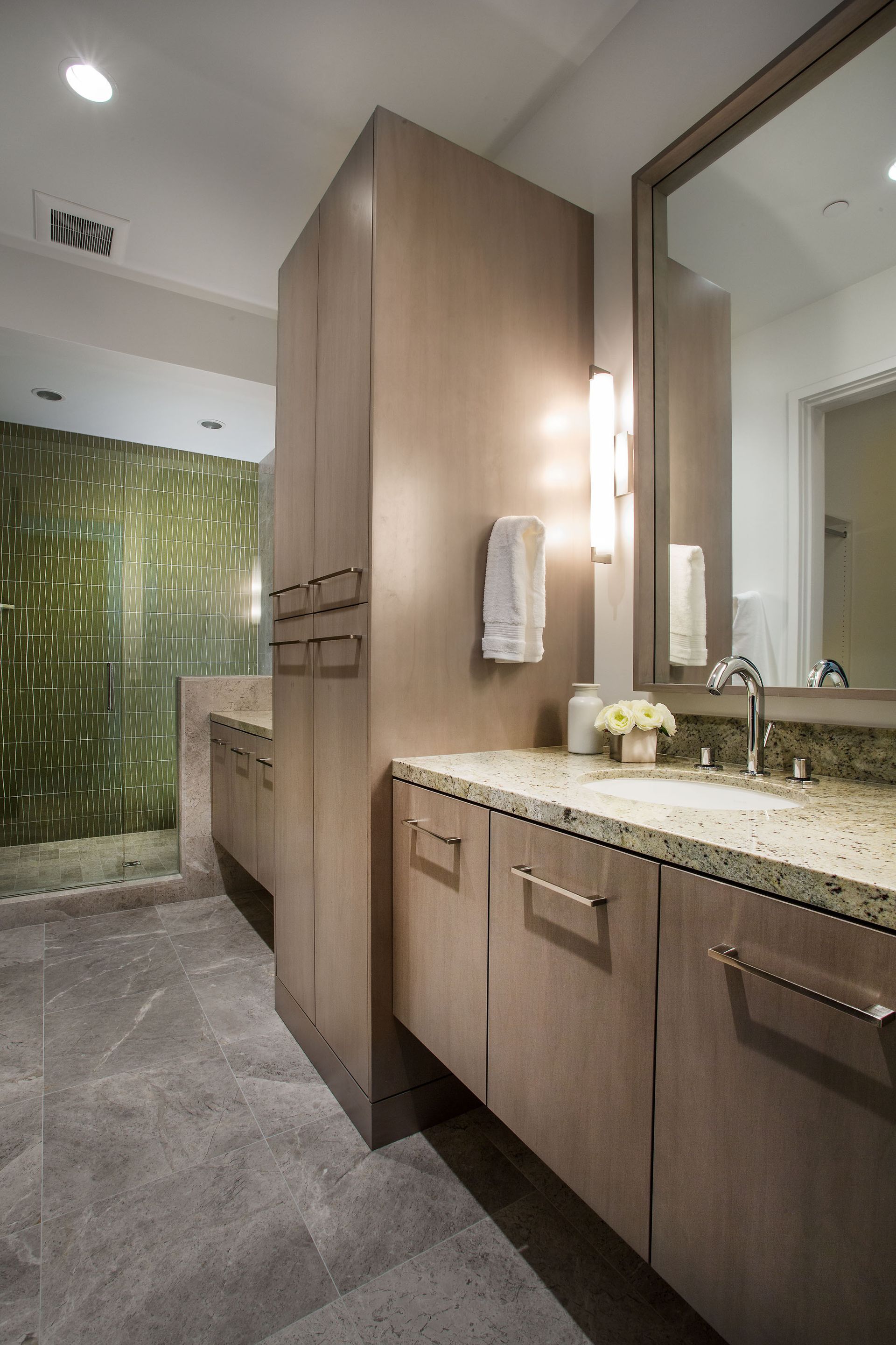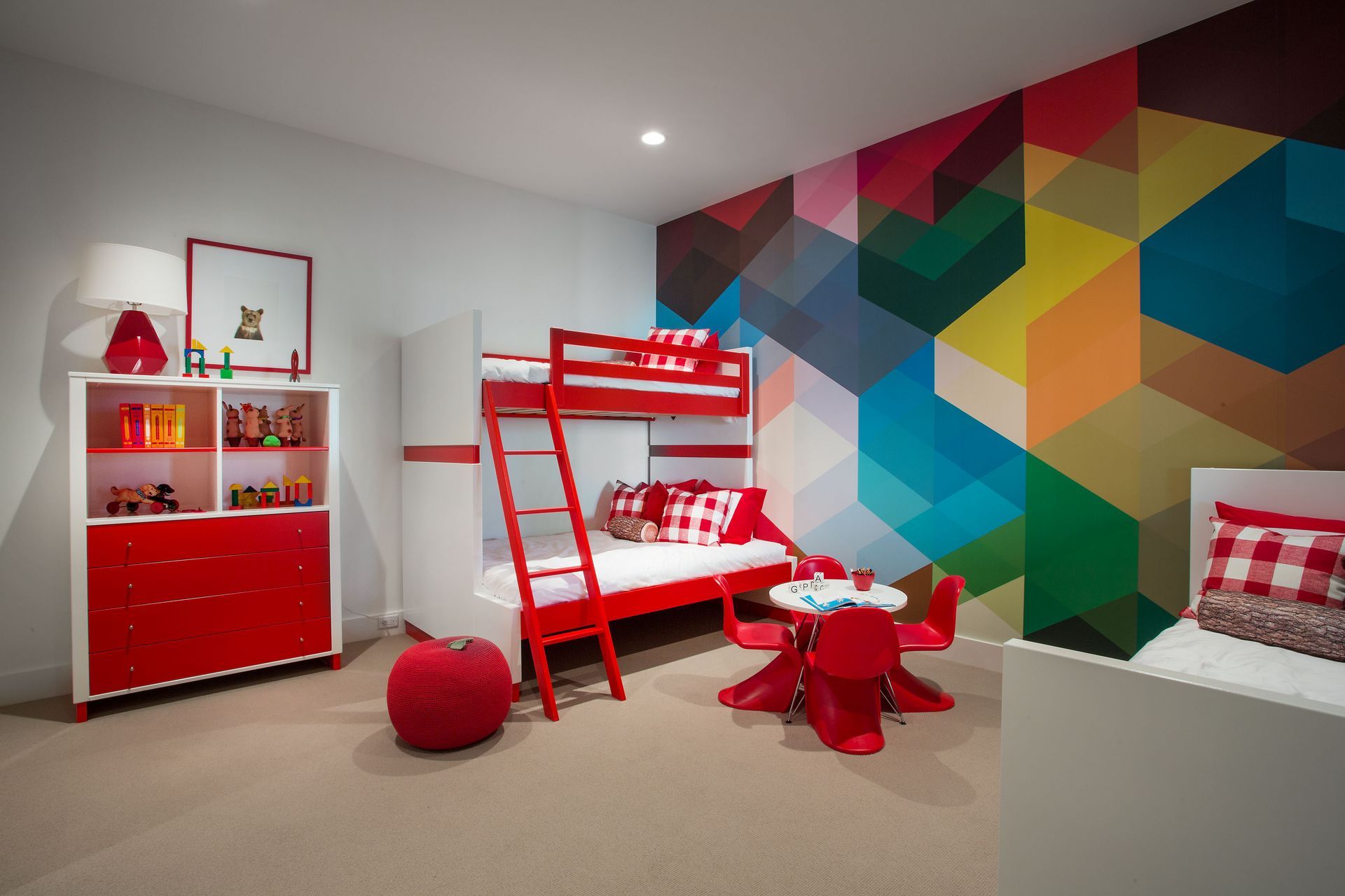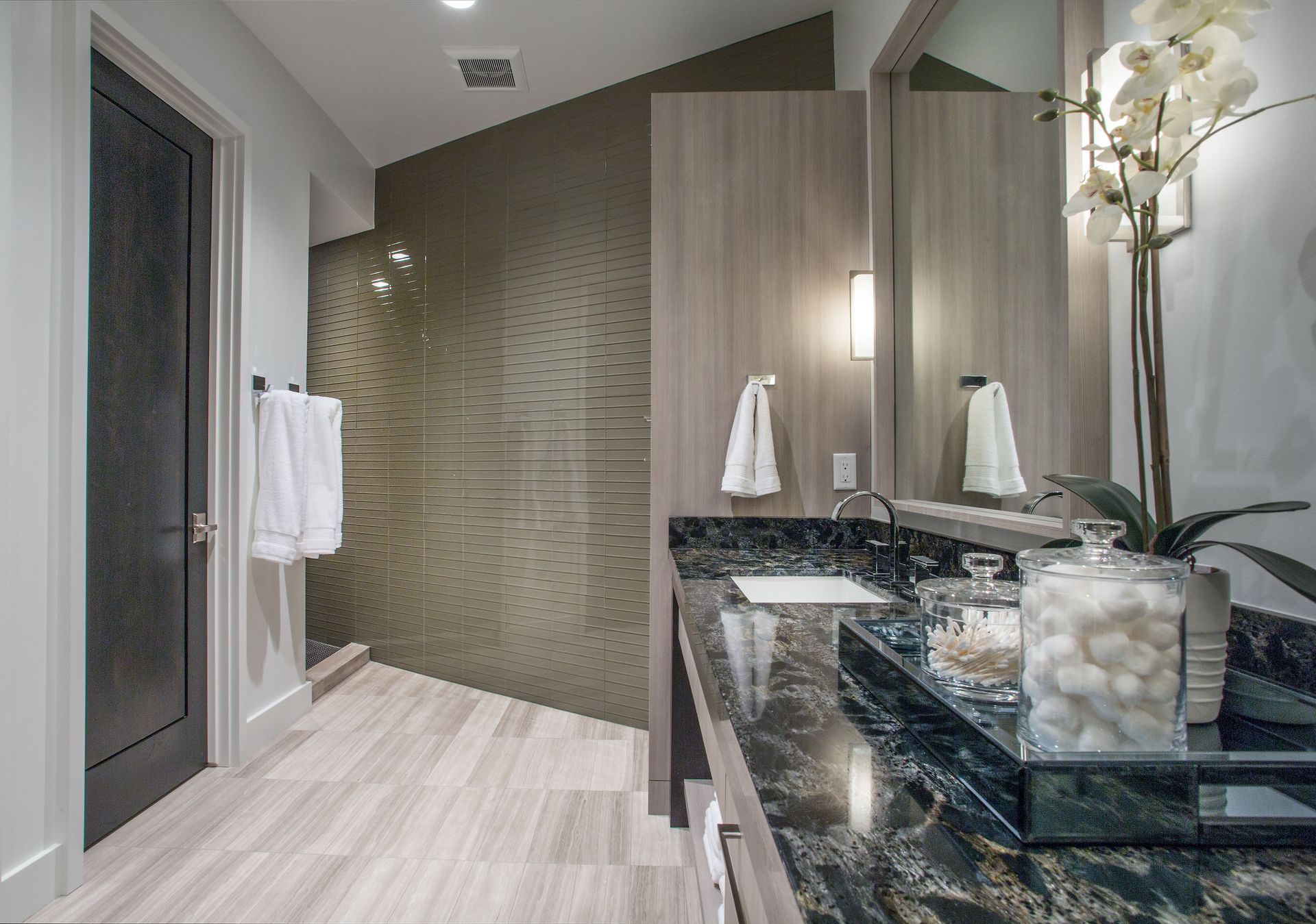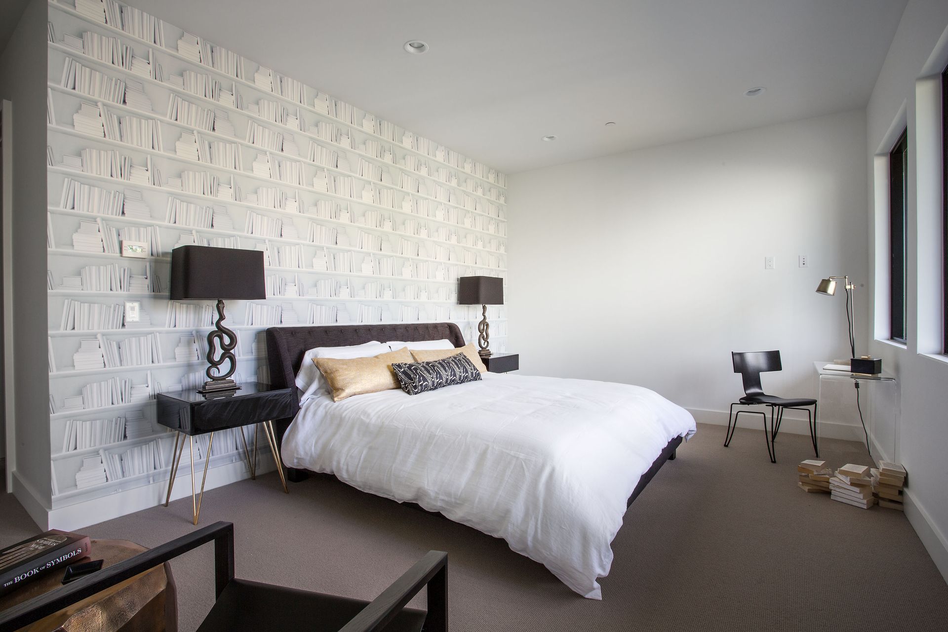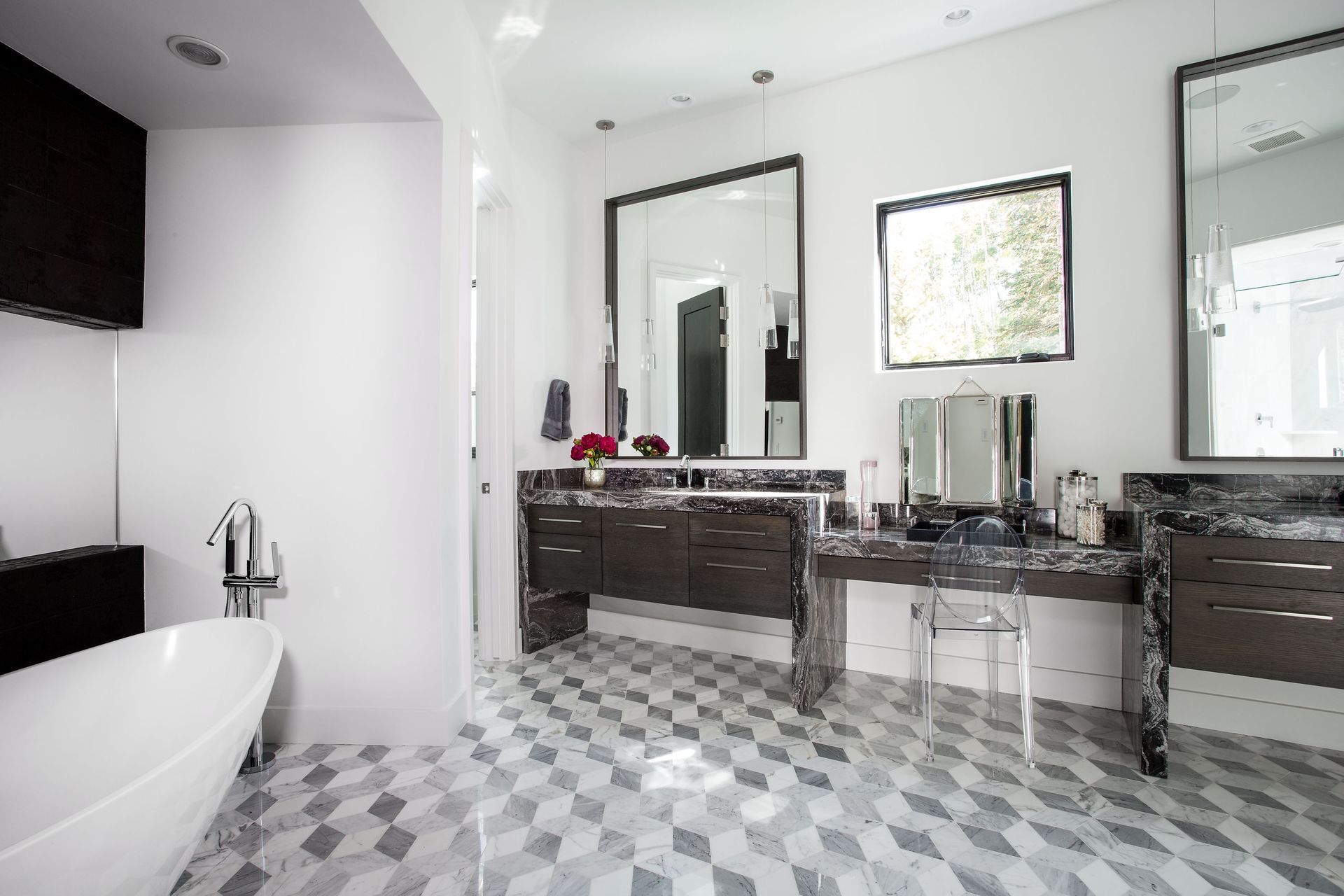 In the wide-open great room multiple sitting areas boost the living area’s functionality. A wet bar, pantry and working area merge in the nearby kitchen and a curved, single-level island performs double duty as a counter and breakfast bar for the kitchen and the dining areas. A mix of fabrics and low-profile furnishings compose a space that delineates the open space without detracting from the views. The clean-lined forms and the contrasting colors curated a space that interplays with light and dark, a dialogue that is compelling and interesting with shots of bold color, organic materials, sparkling Lucite and spirited wallpaper.