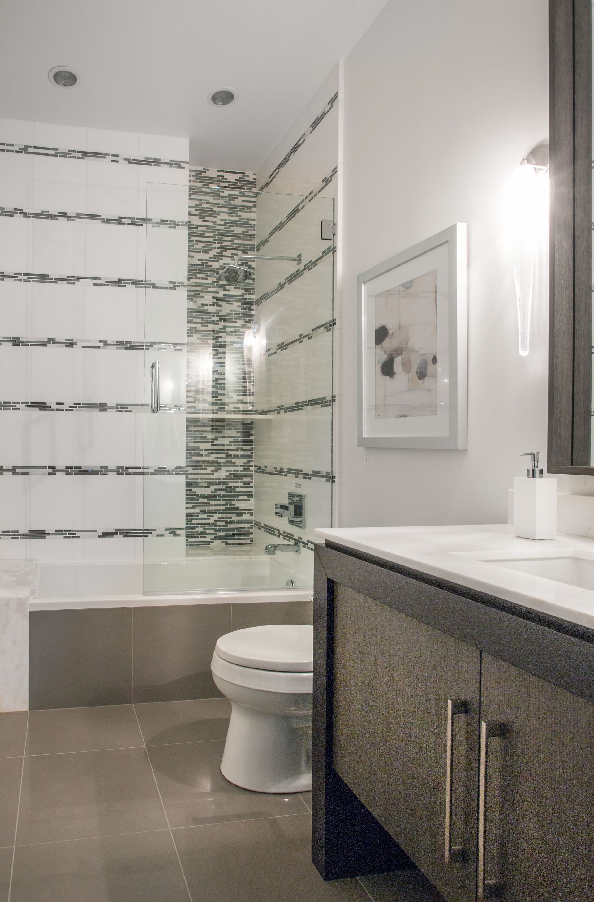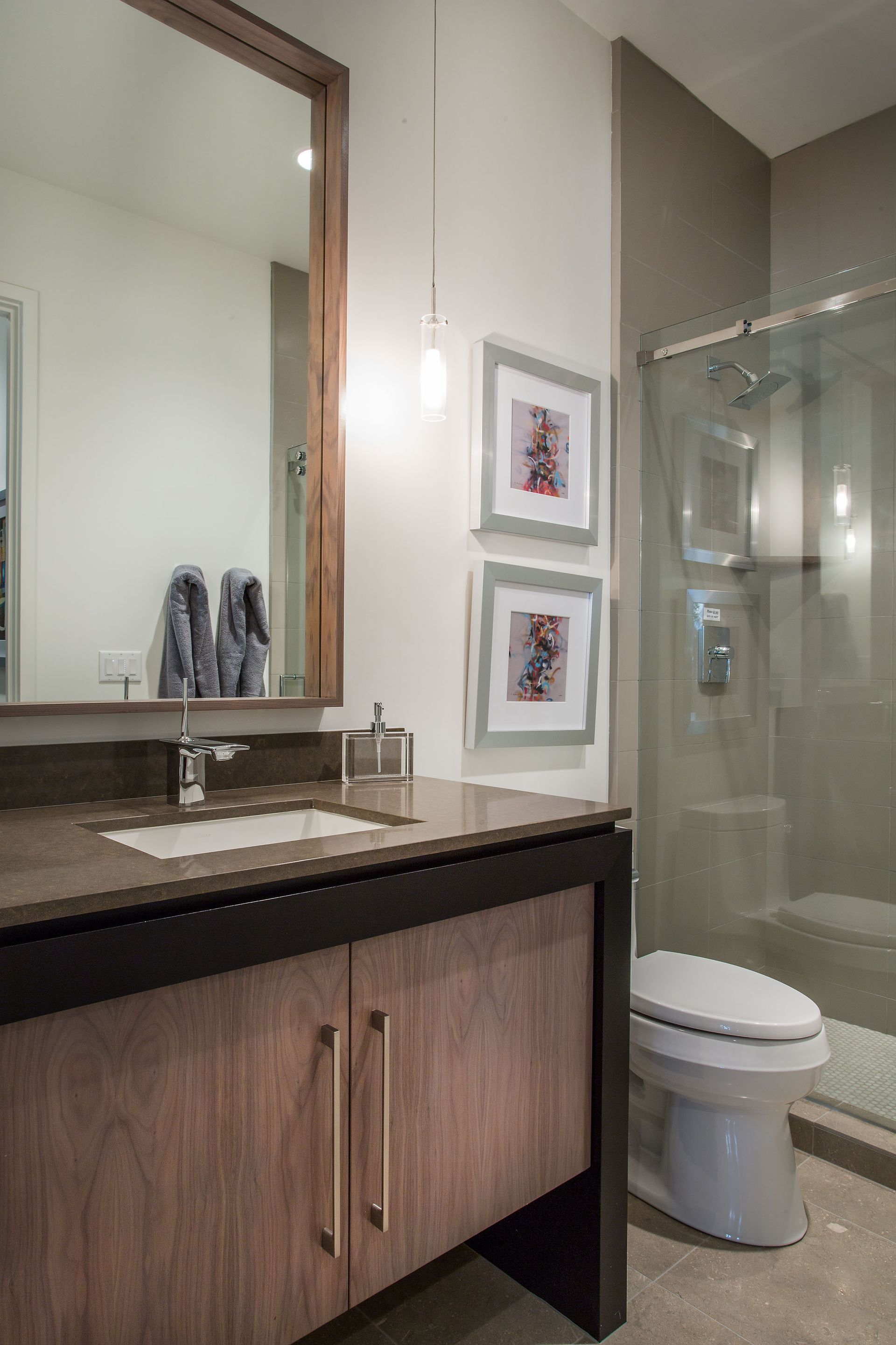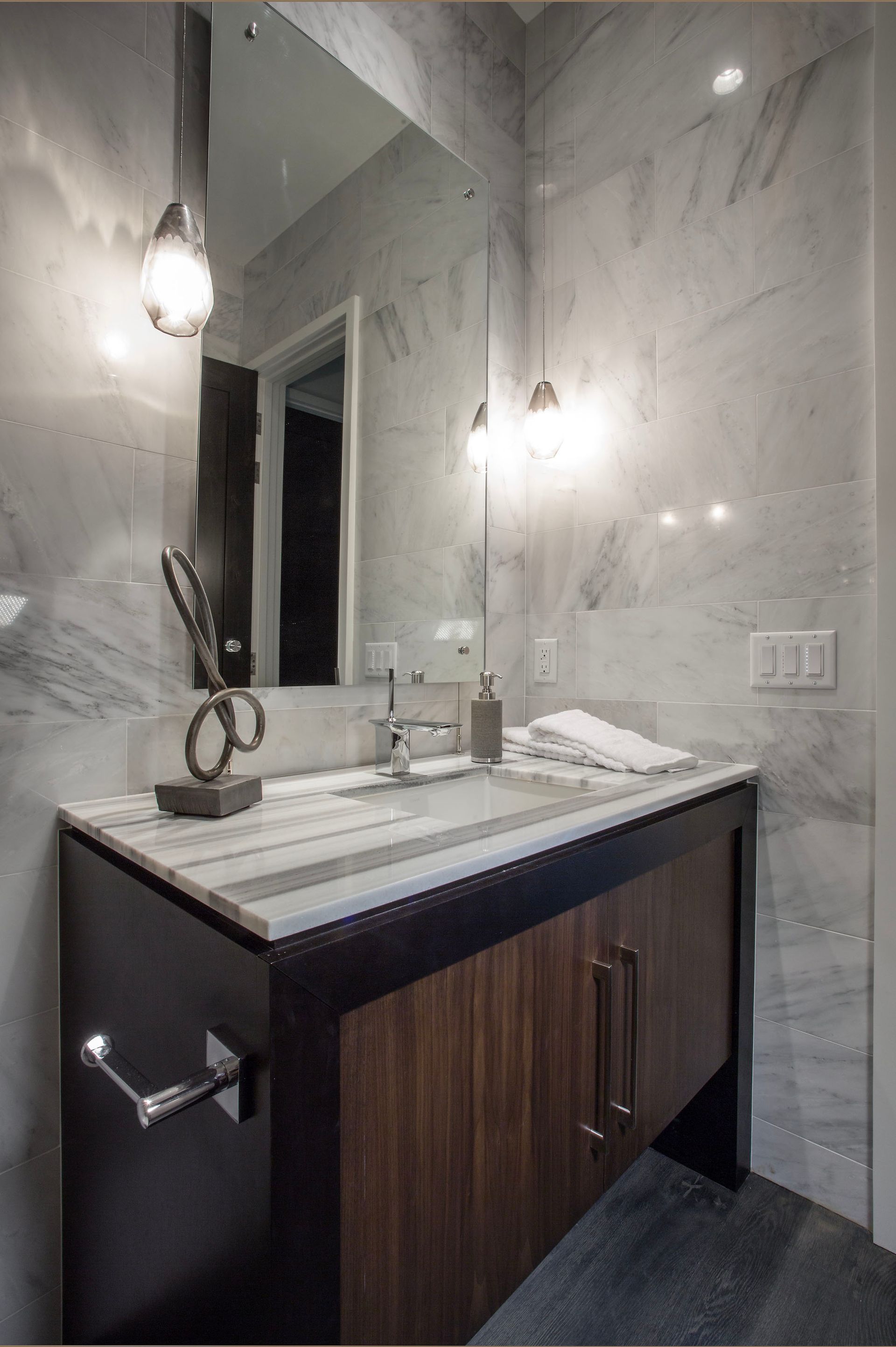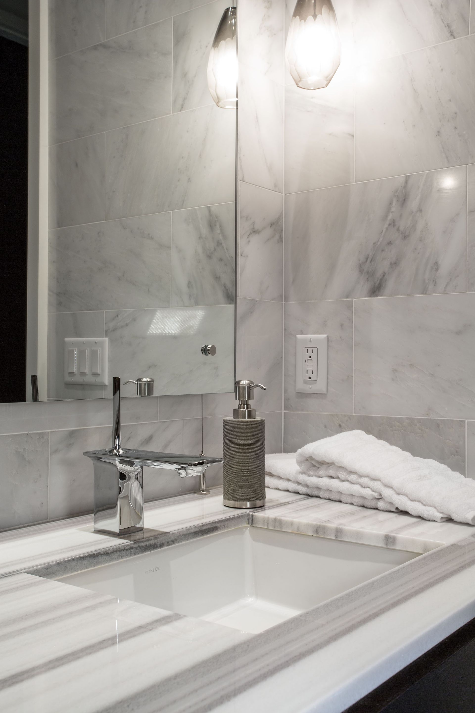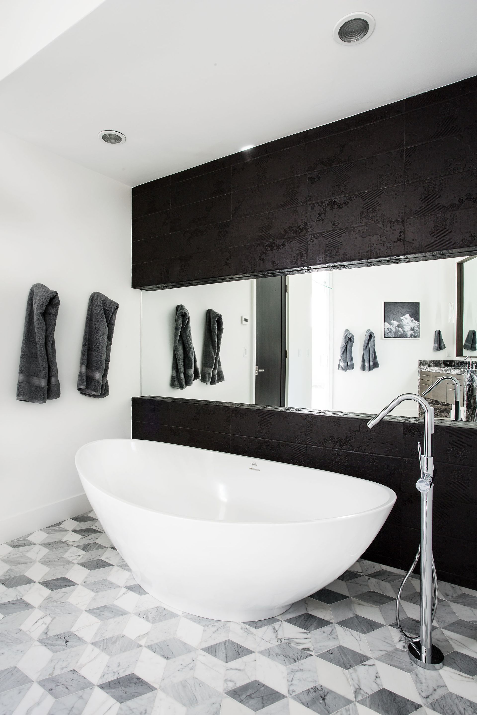 In the wide-open great room multiple sitting areas boost the living area’s functionality. A wet bar, pantry and working area merge in the nearby kitchen and a curved, single-level island performs double duty as a counter and breakfast bar for the kitchen and the dining areas. A mix of fabrics and low-profile furnishings compose a space that delineates the open space without detracting from the views. The clean-lined forms and the contrasting colors curated a space that interplays with light and dark, a dialogue that is compelling and interesting with shots of bold color, organic materials, sparkling Lucite and spirited wallpaper.