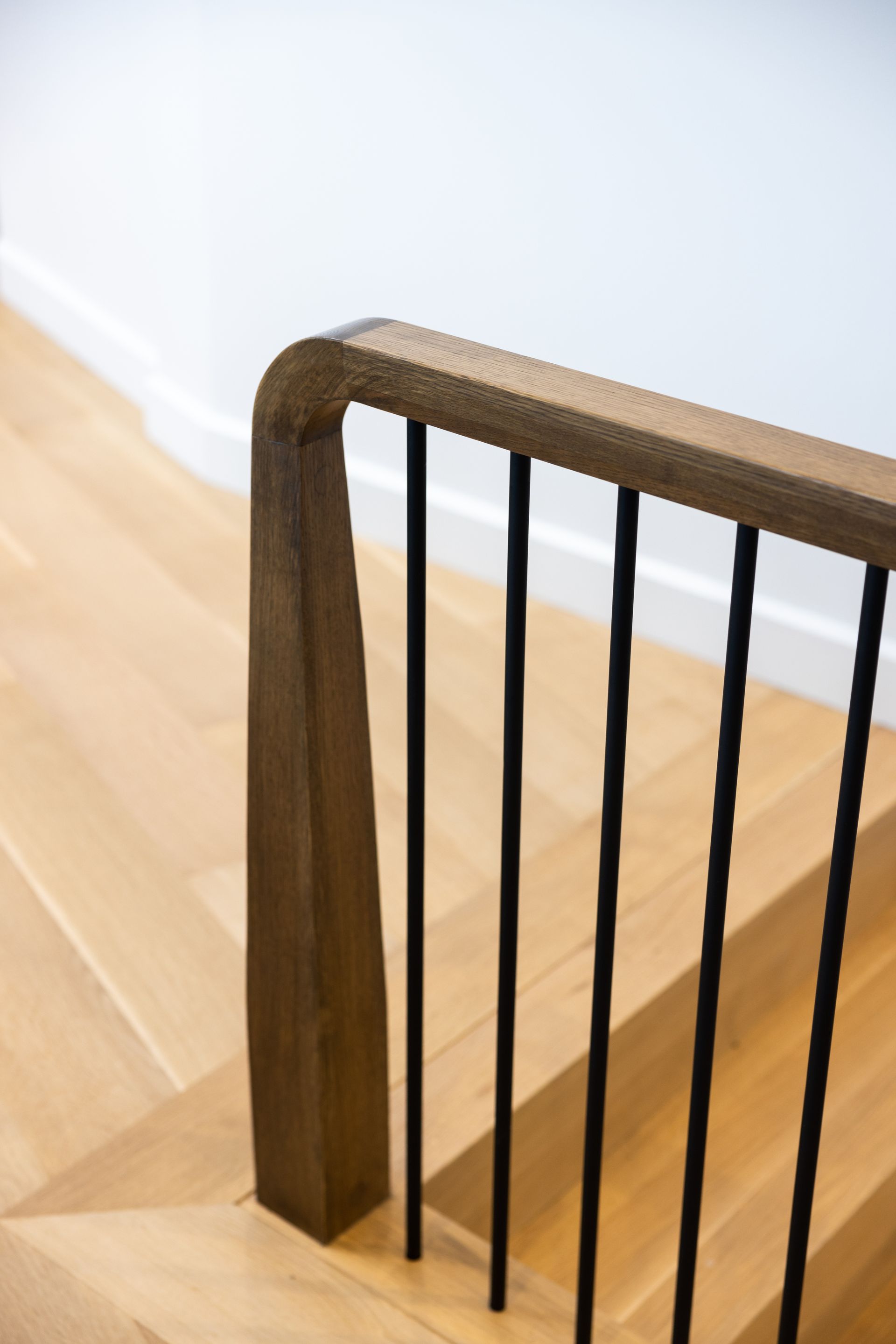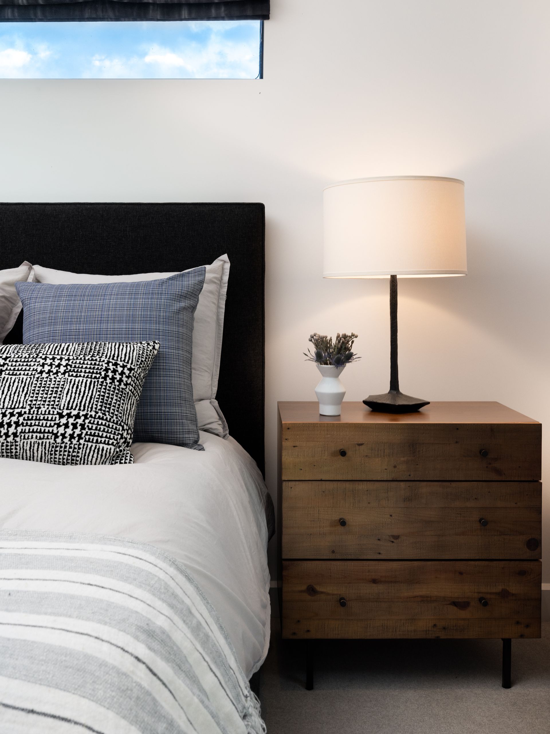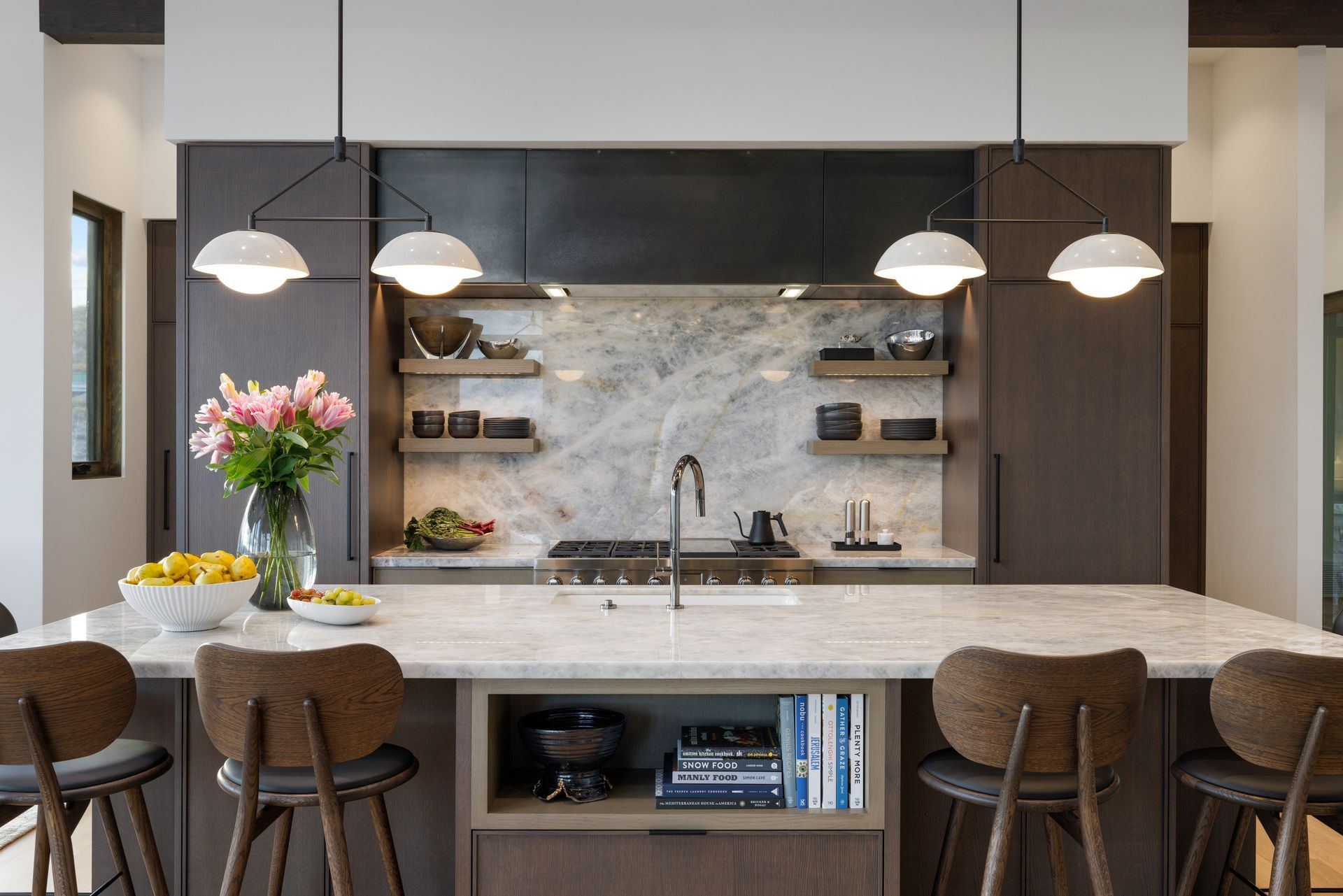 Together, the kitchen and butler’s pantry utilize symmetry and balanced division of space to create a functional and beautiful cooking area and gathering space. The slab backsplash acts as a natural focal point and background for the activity of the kitchen and allows the space to feel open and inviting. Framed by the view, the dining room presents a comfortable experience with upholstered dining chairs inviting you to linger. The angled and crossing lines of the table base and light fixture break up the space and accent the lines created by the ceiling beams that extend outdoors once again drawing the eye to the mountains and reservoir beyond.