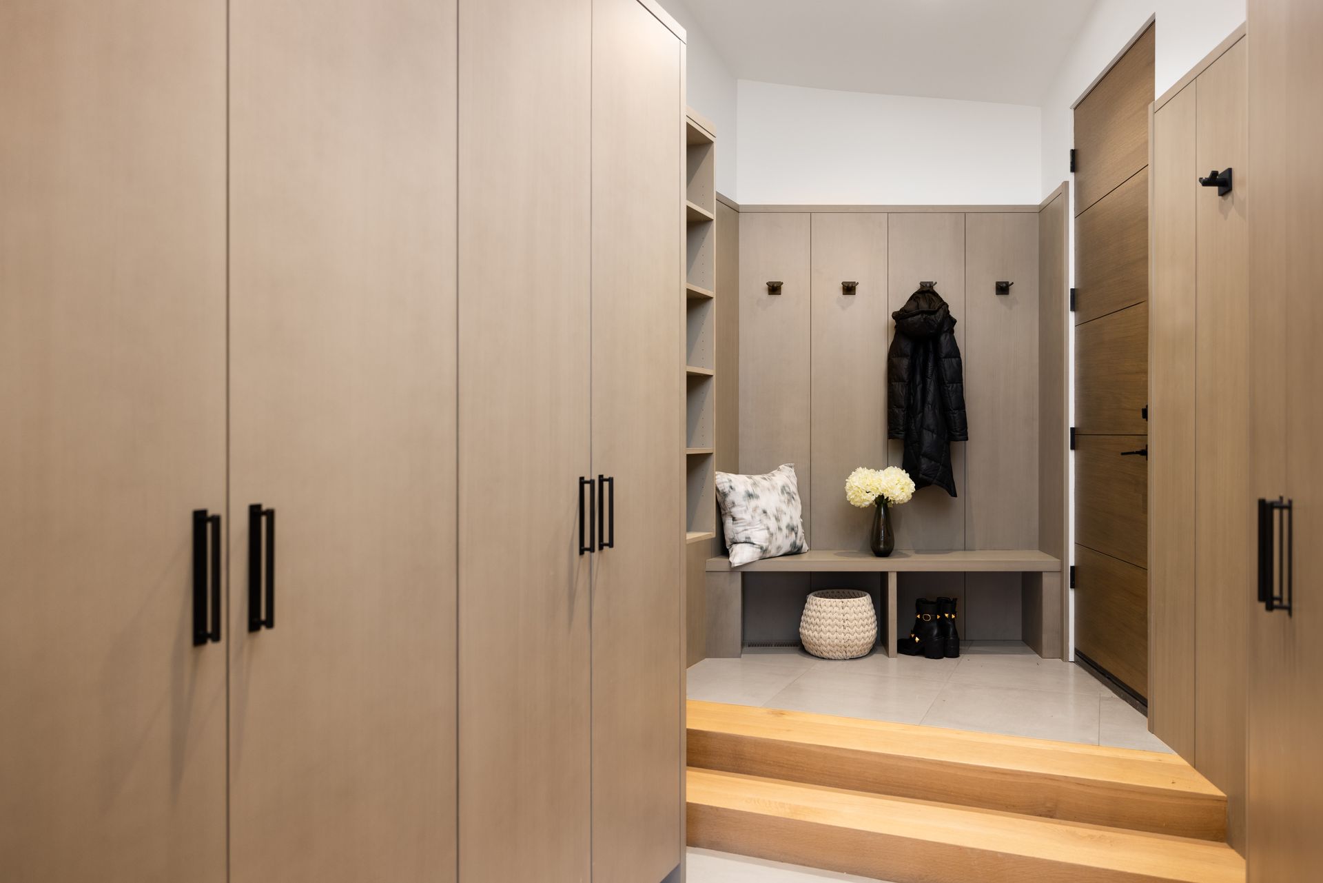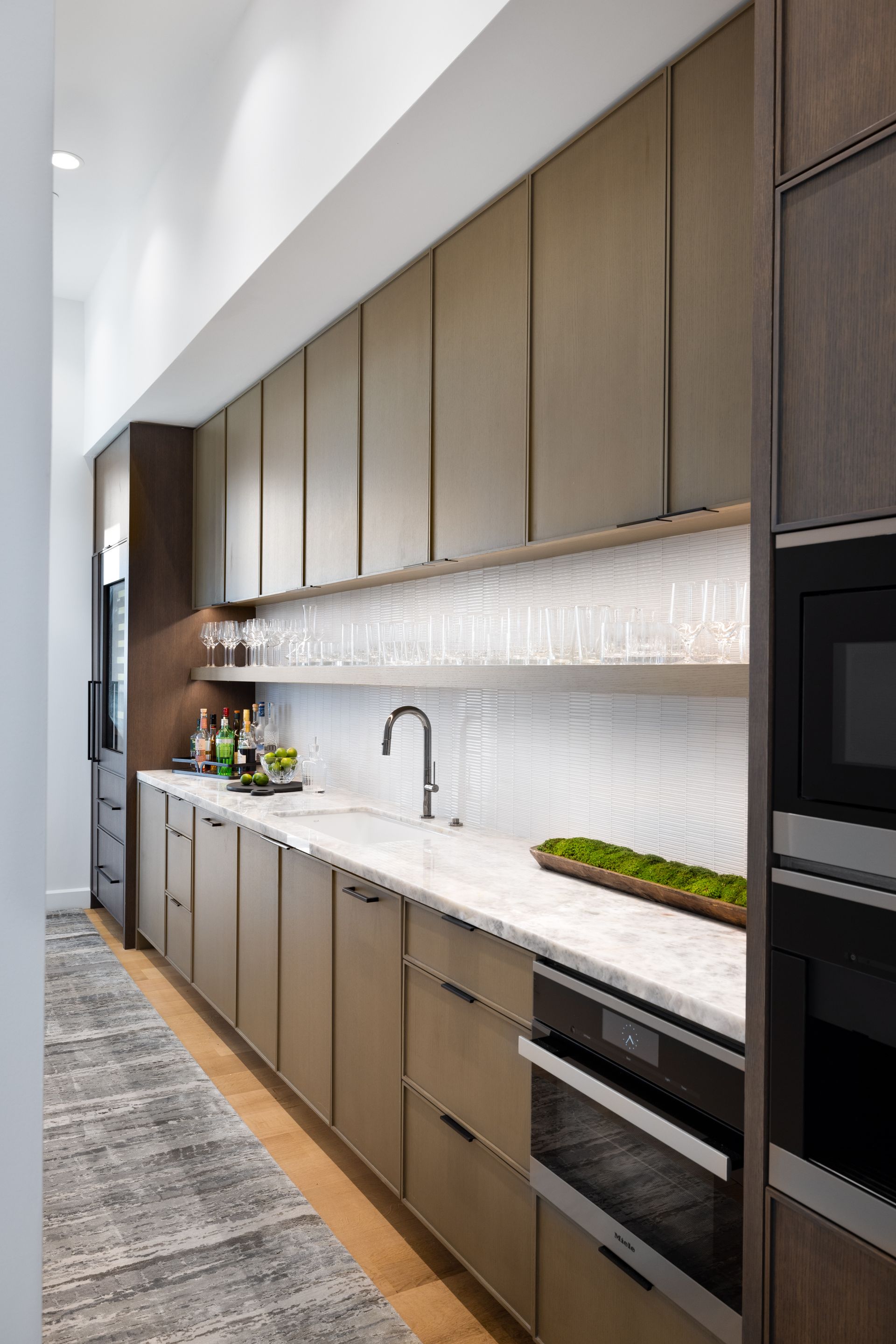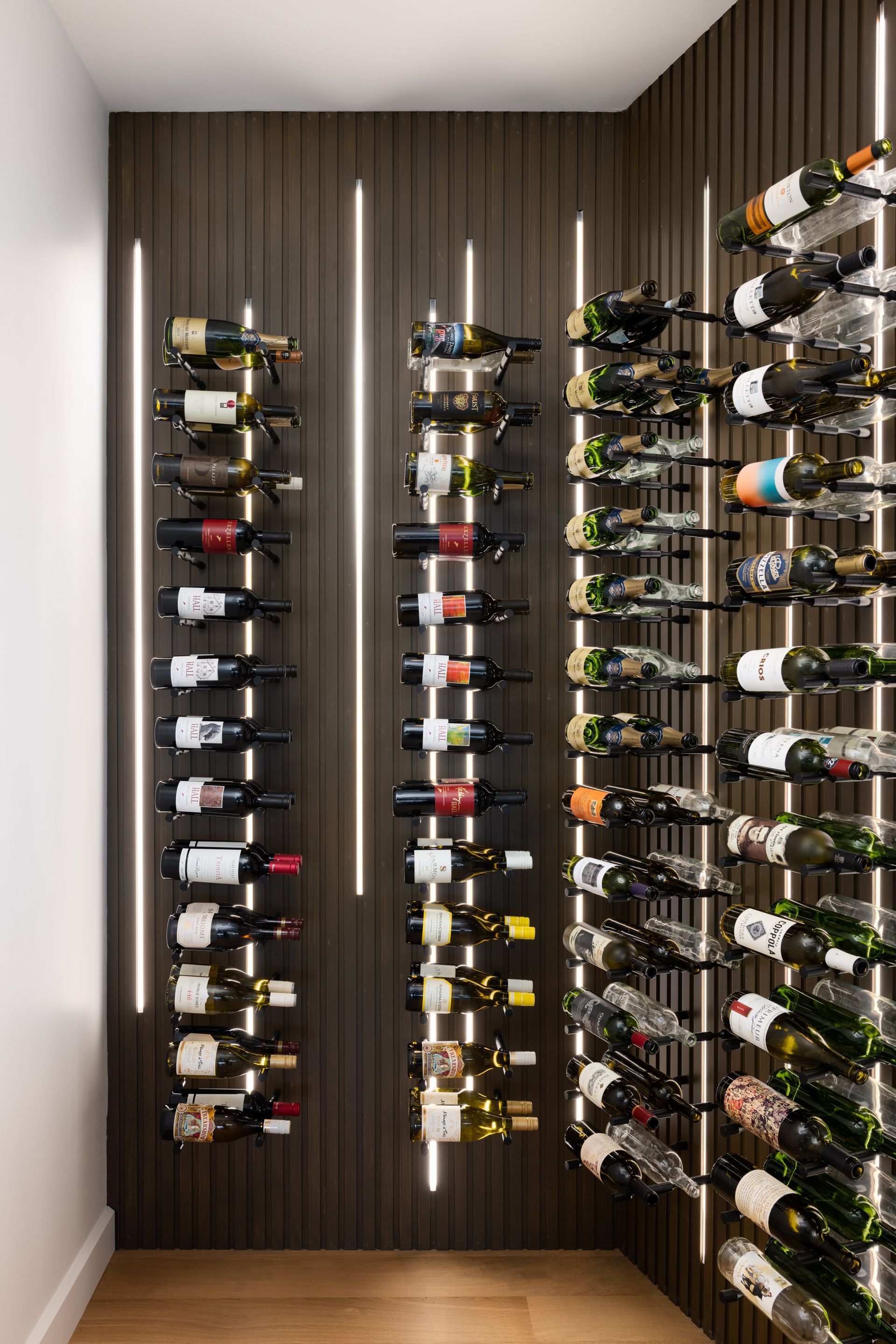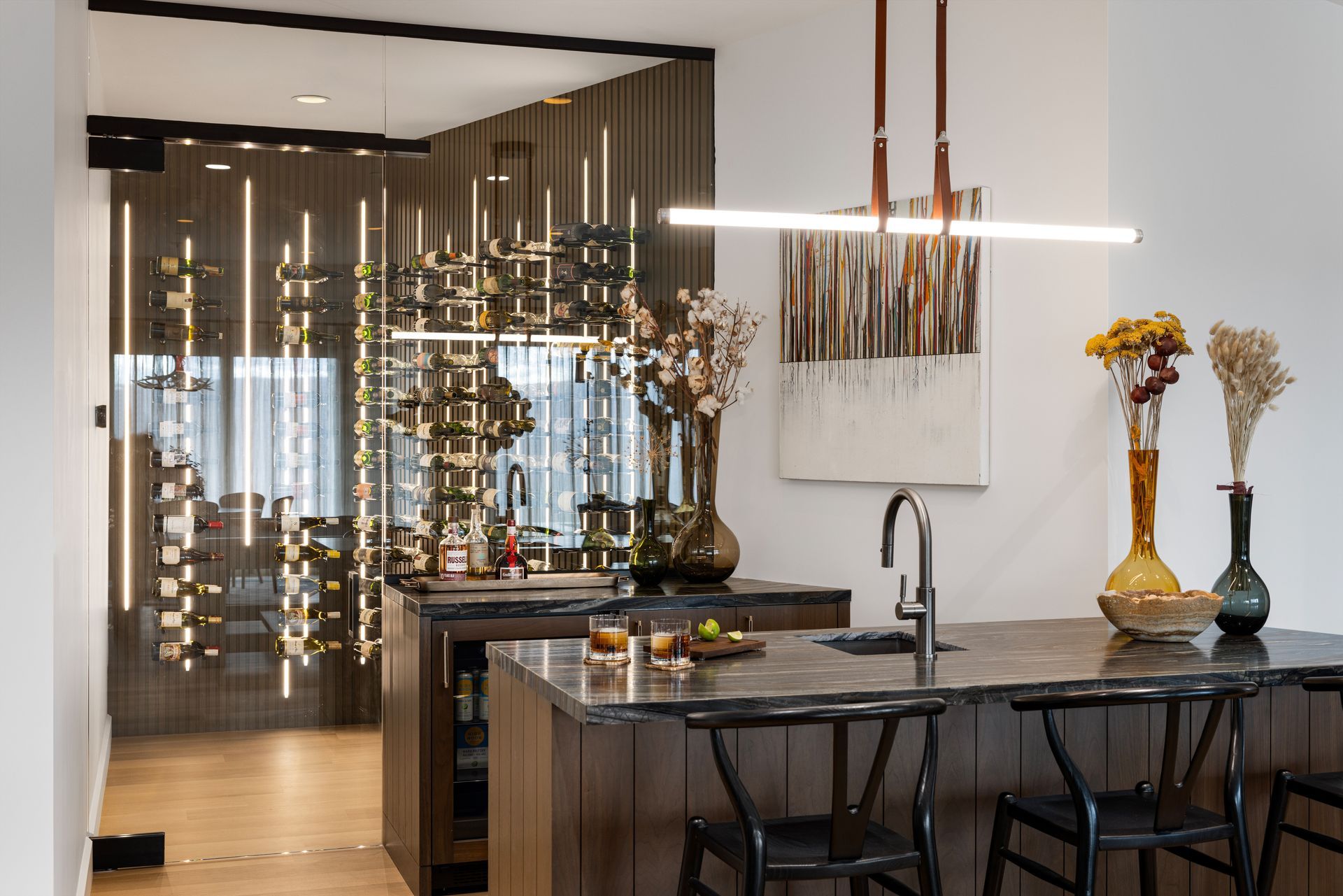The wood slats and LED strip lights in the wine room uses light and shadow to break up the space with intriguing linear forms also represented by the horizontal linear bar pendant. The outward angled wall and glass door invites you in as you explore the family room and offers a sophisticated bar experience.