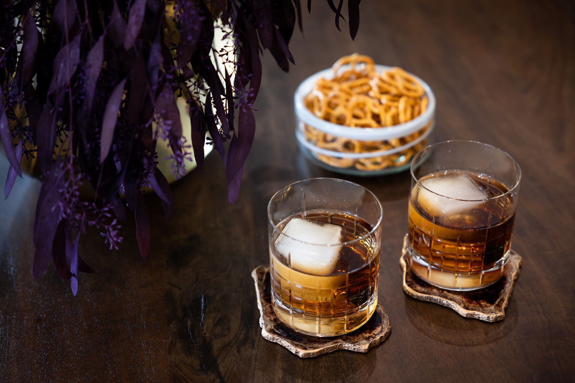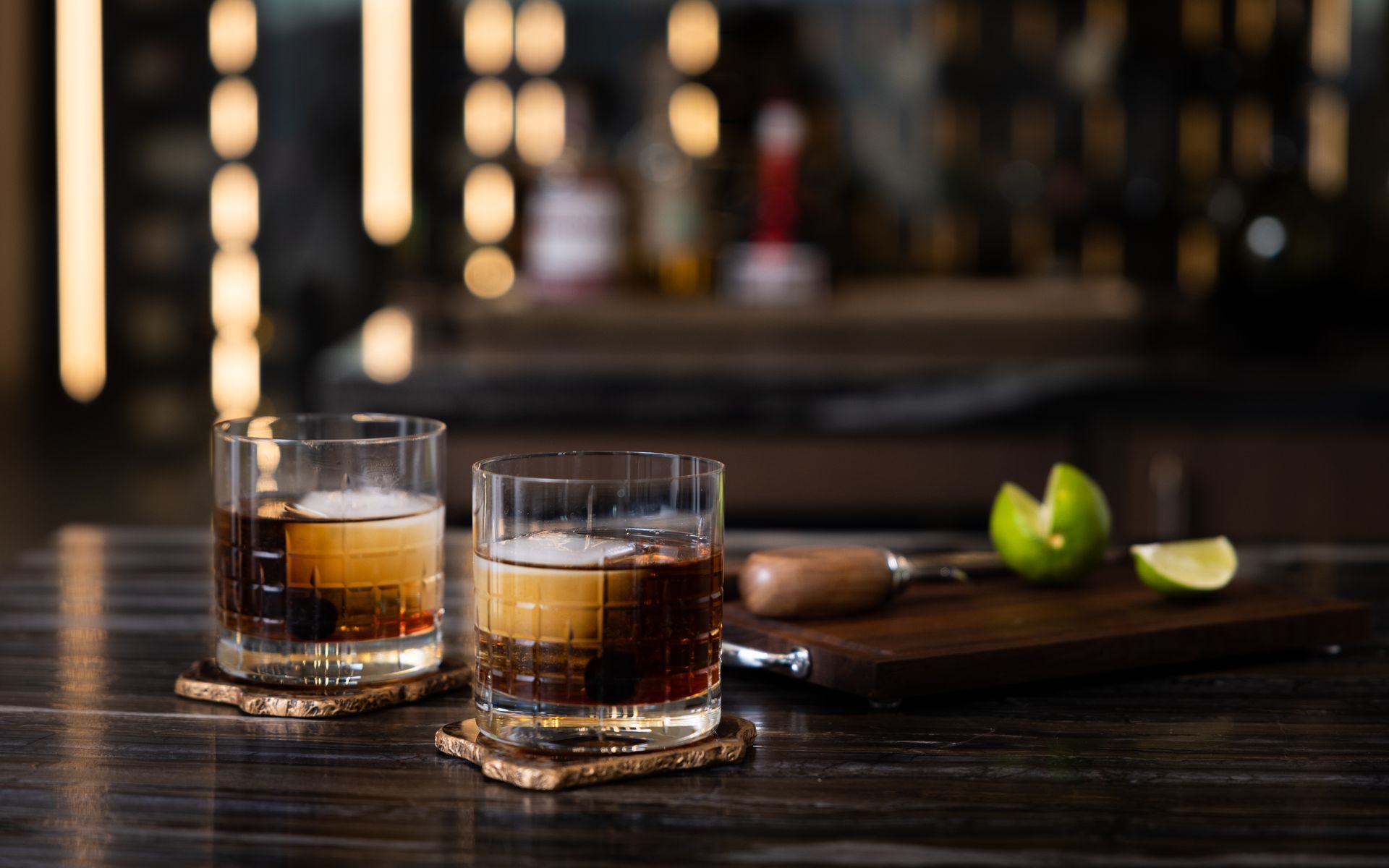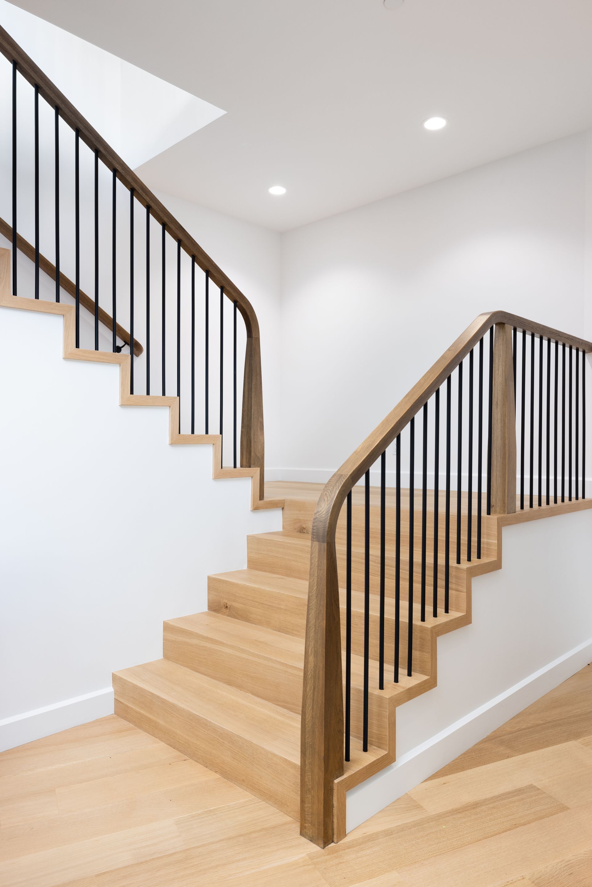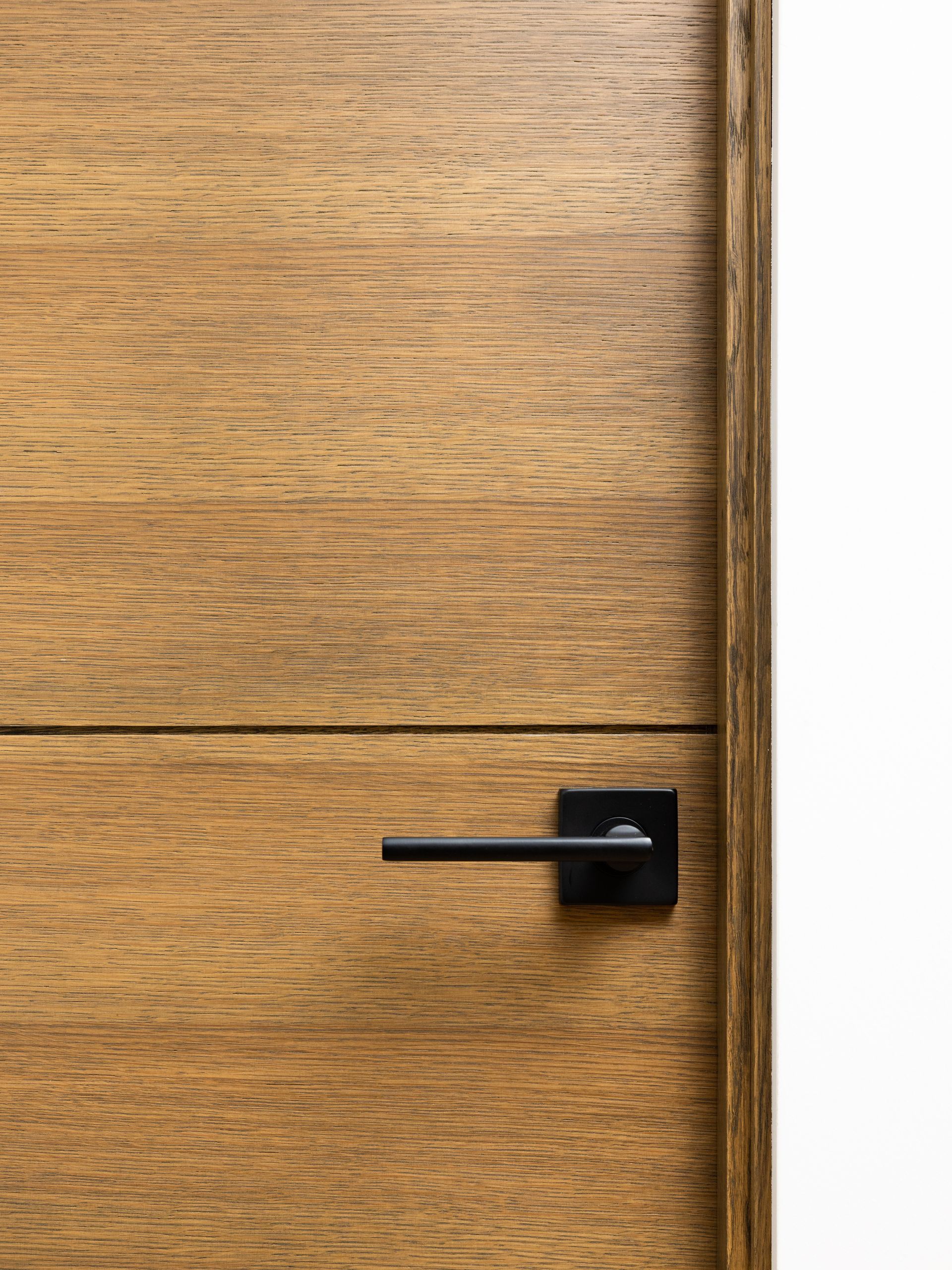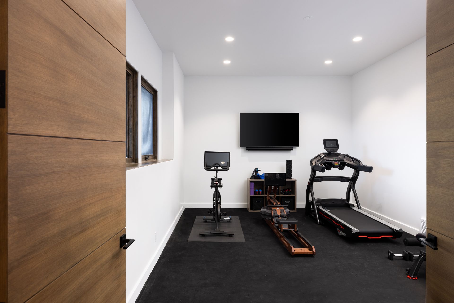 The wood slats and LED strip lights in the wine room uses light and shadow to break up the space with intriguing linear forms also represented by the horizontal linear bar pendant. The outward angled wall and glass door invites you in as you explore the family room and offers a sophisticated bar experience.