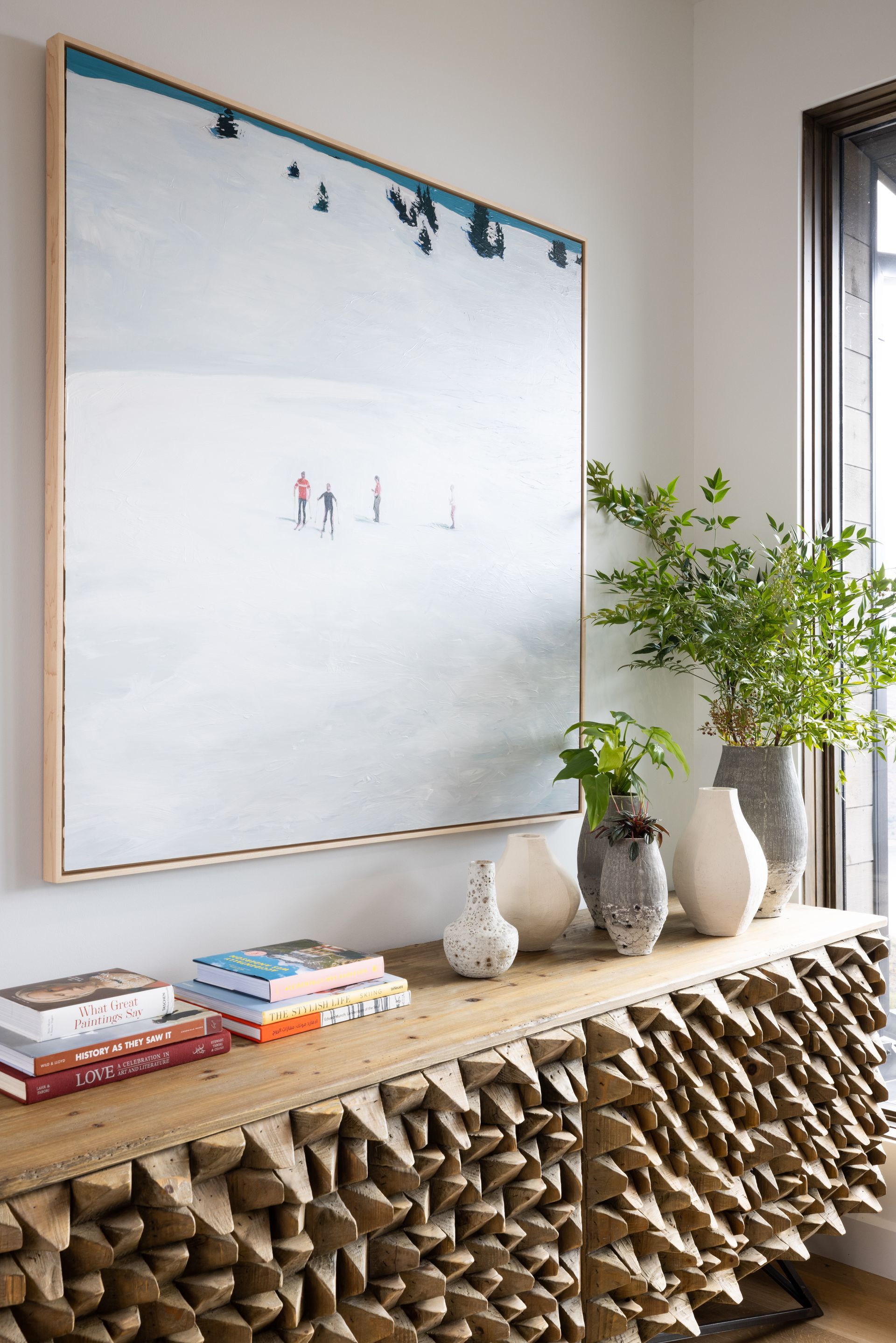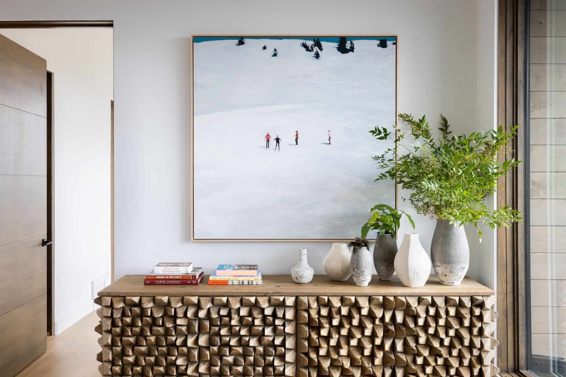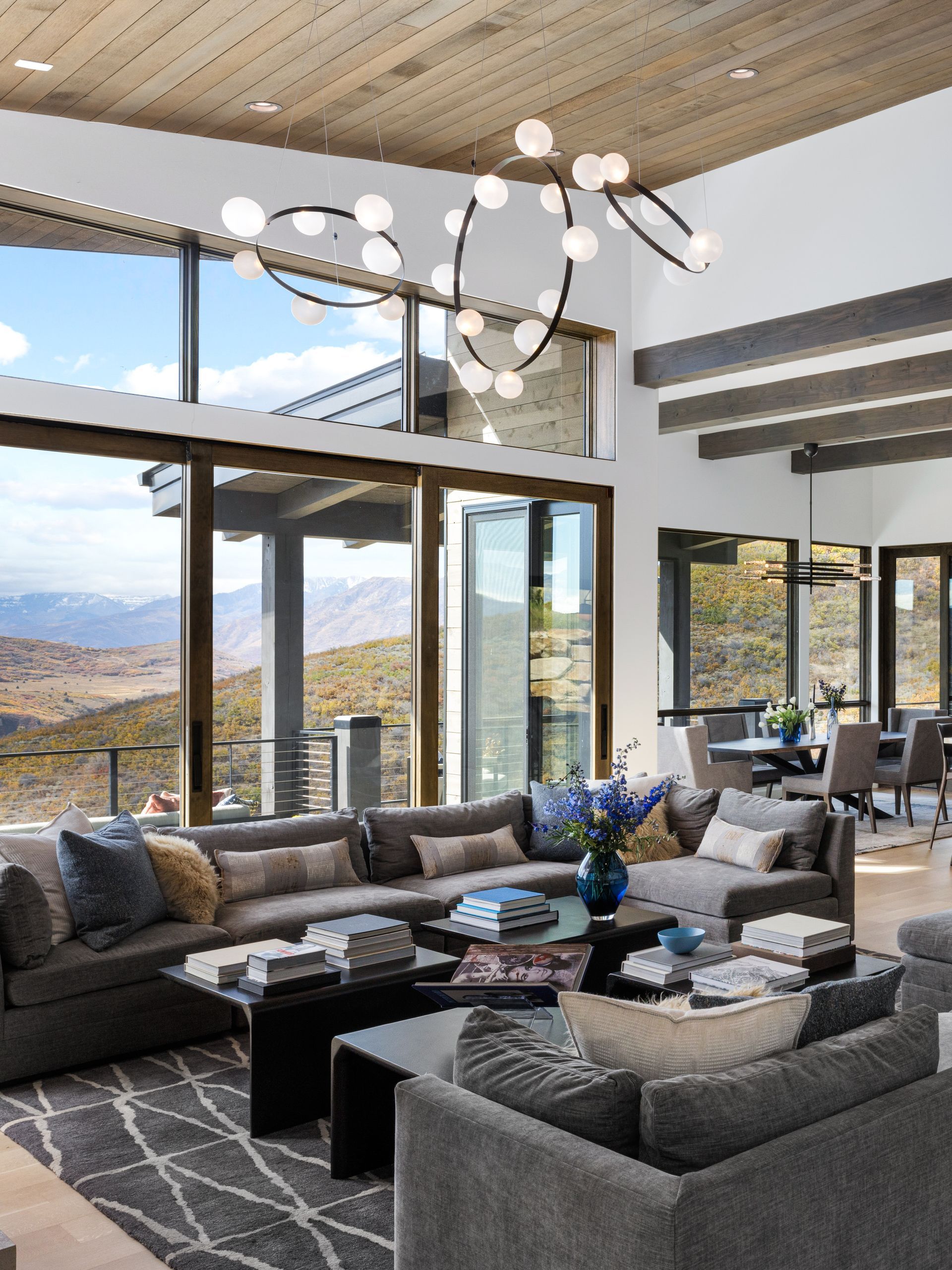 The entry door opens to light and airy space encompassed by the expansive views through windows on each side of the residence. The furnishings and finishes of the space compliment the exterior landscape, bringing the outdoors in, with comfortable and open forms that maximize the views and allow visitors to experience the landscape. The great room carries the light and airy nature of the entry throughout the home with its large windows and wall opening doors to connect the outdoors and interiors. The comfortable upholstery softens the architectural lines with muted textiles that express the client’s style and accents the mountainous Jordanelle region. The neutral palette with hits of color creates the feeling of a wildflower landscape with various natural discoveries one might encounter in the area. The strong feature fireplace and contemporary pendants add sophistication and elegance drawing the eye to the details of the space.