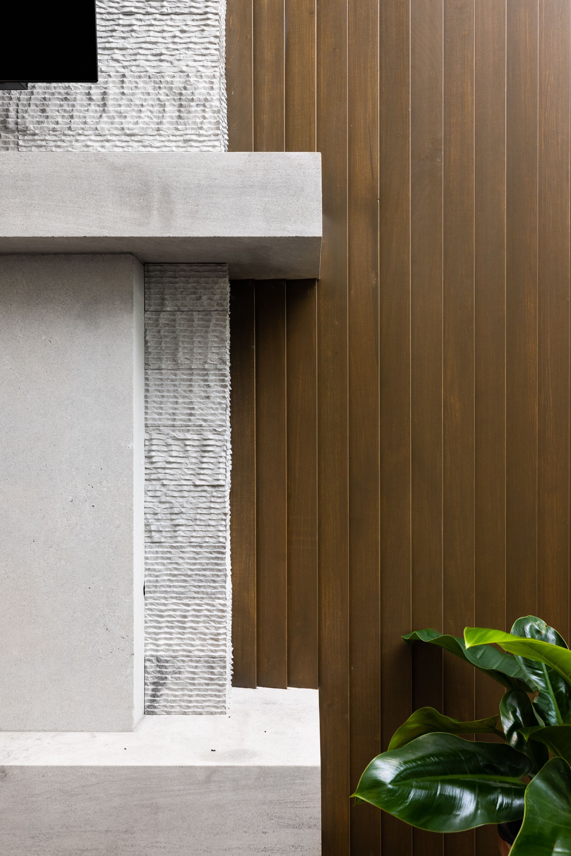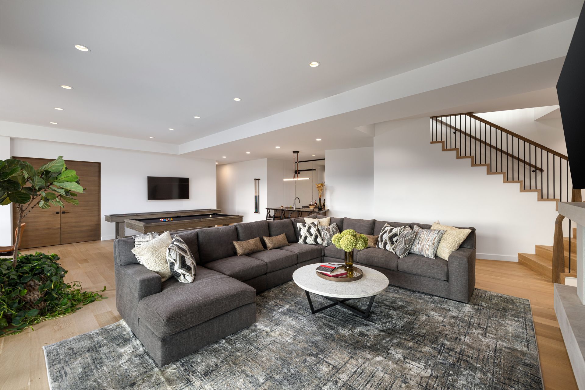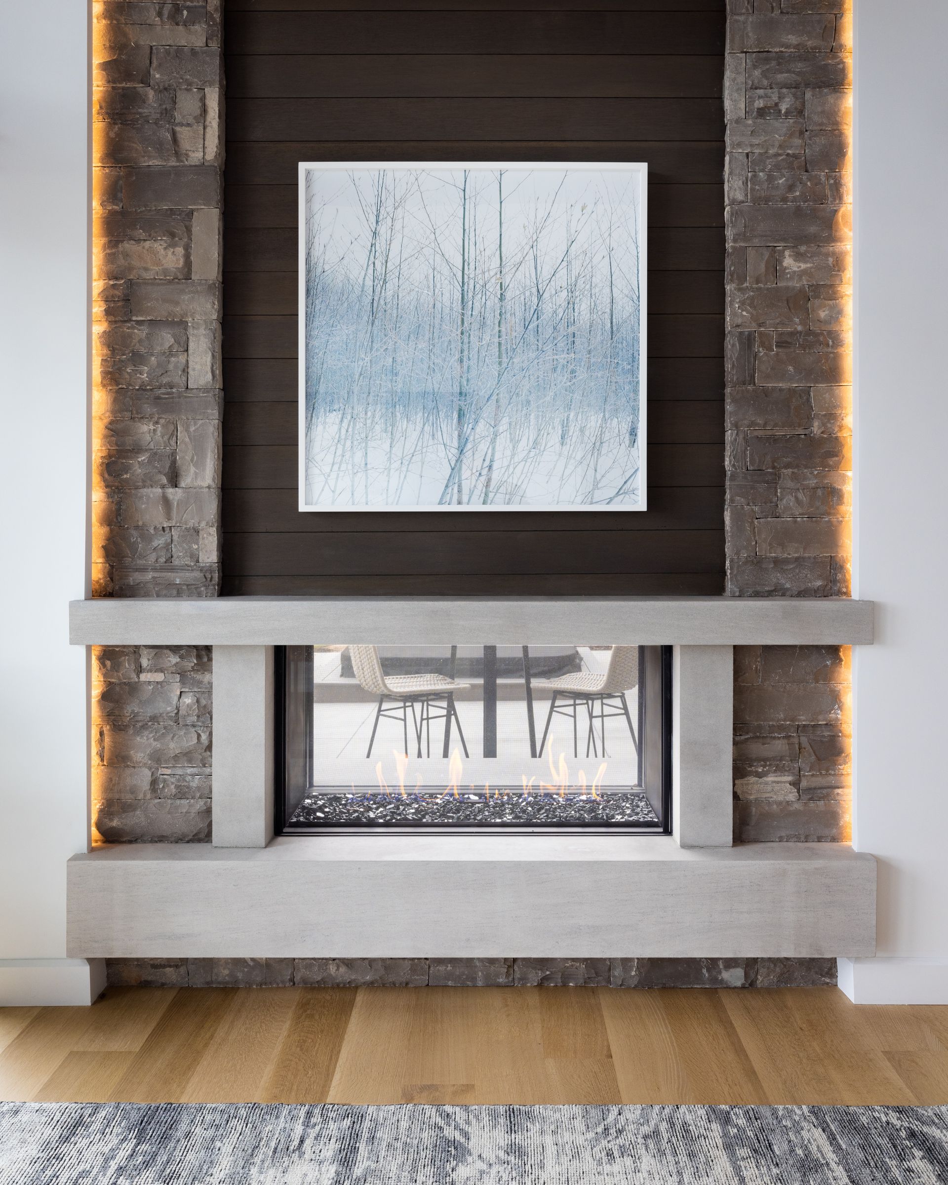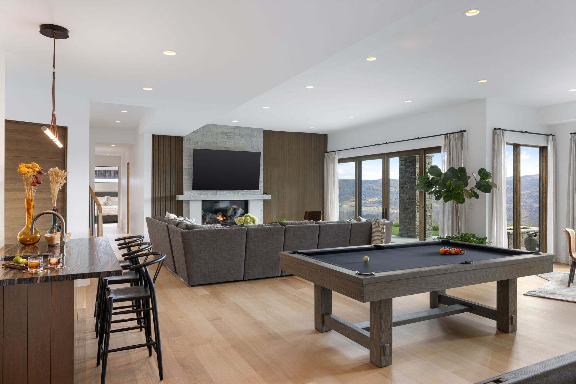 In the lower family room, the angled tongue and groove wood slats to either side of the fireplace play with light and shadow adding texture and intrigue to the space. The natural elements from the great room above and outdoor living spaces are carried throughout the lower level of the residence continuing the connection to the exterior environment. The pops of color mixed within the neutral color palette add artistry to the space as does the amorphic game table rug and accompanying wall artwork. The family room is both comfortable and encourages you to explore its many facets including the adjoining bar and wine room.
