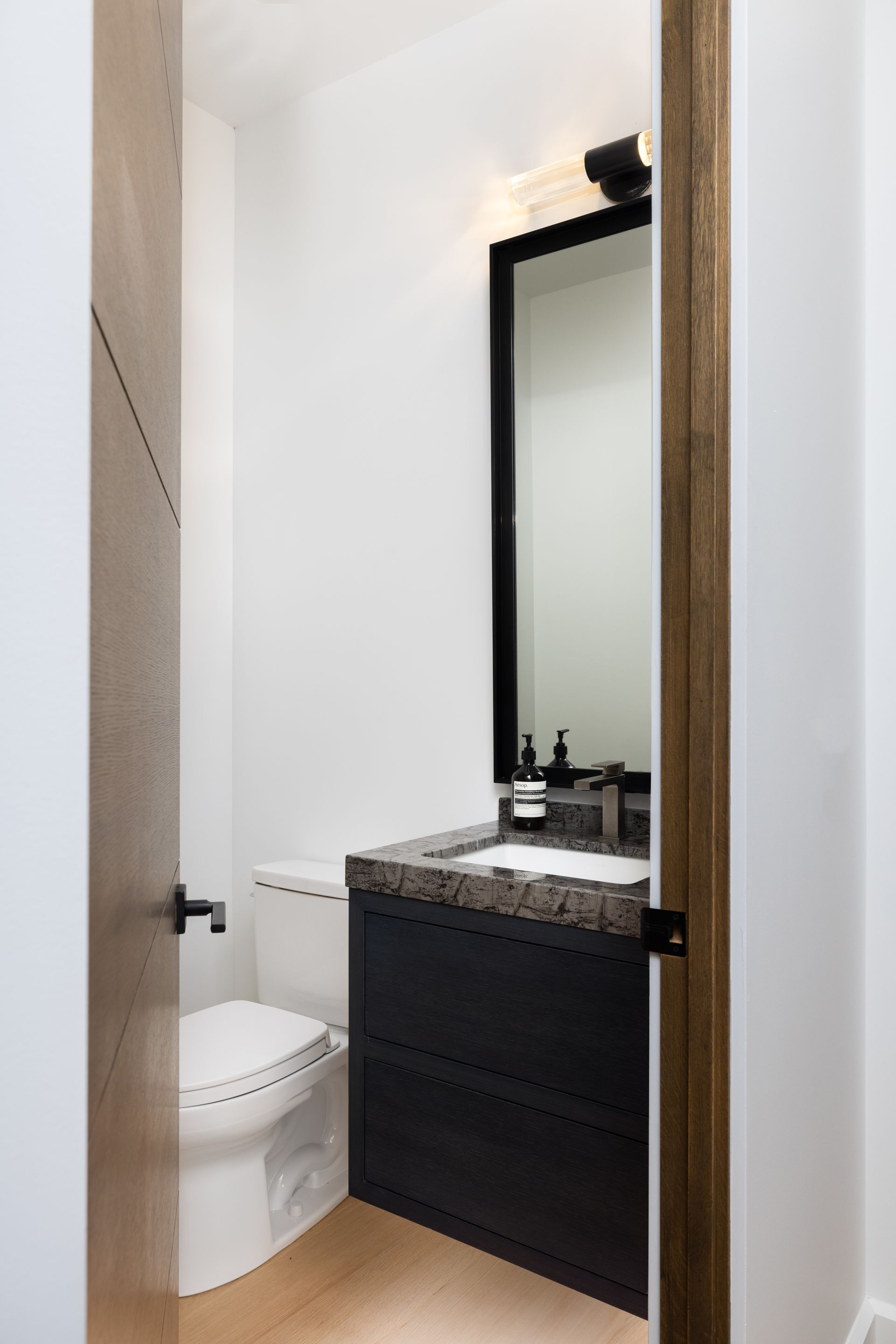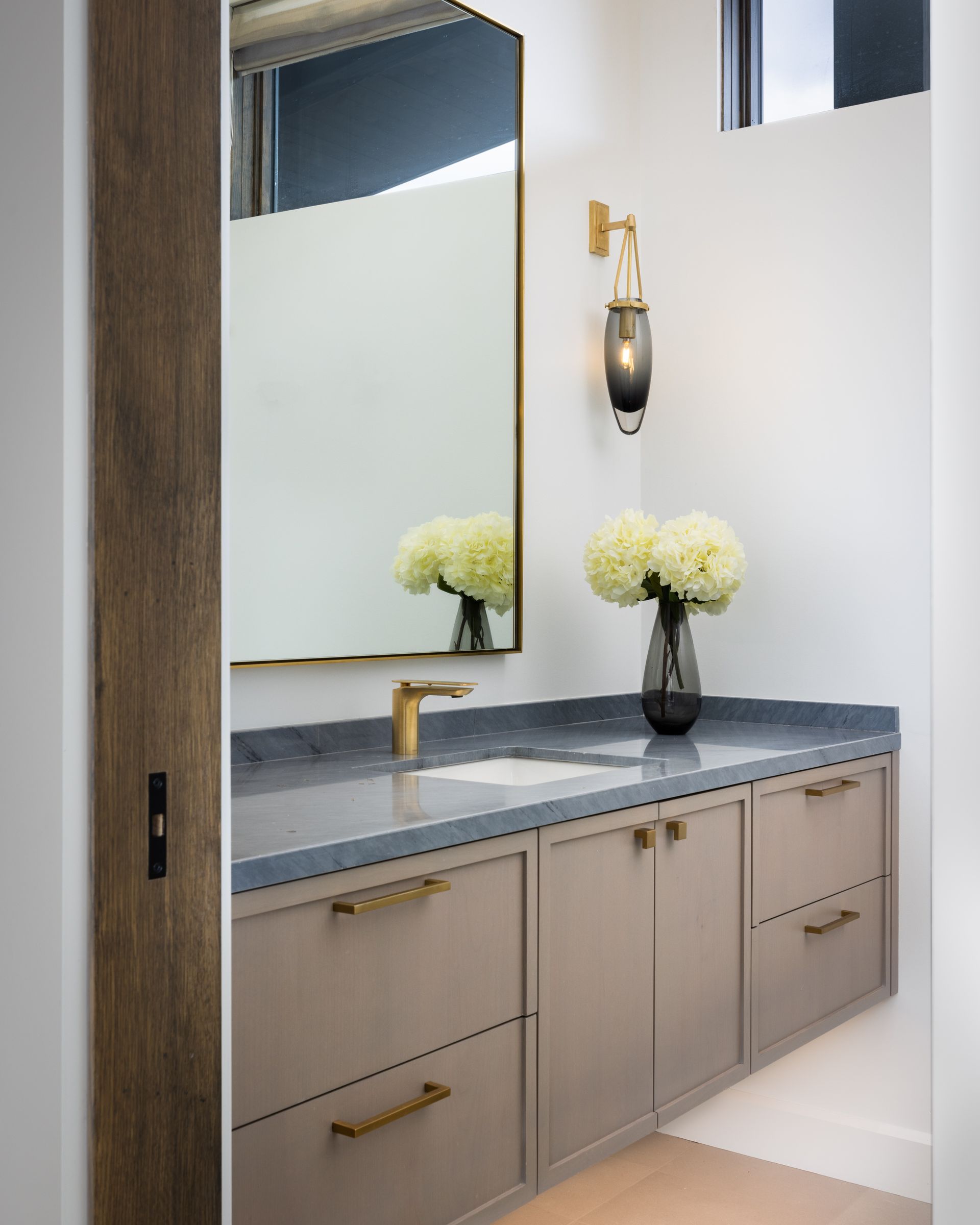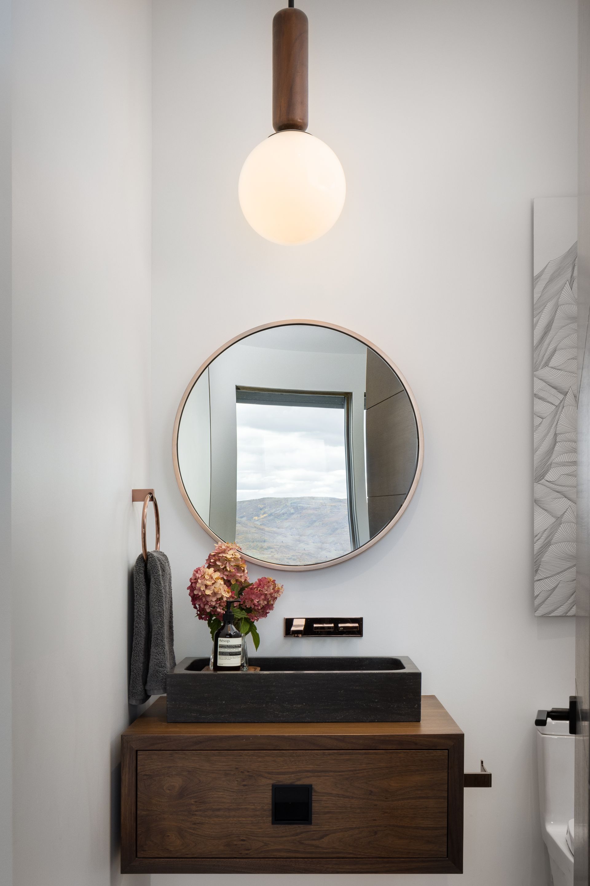 This sophisticated and natural office features a two-sided fireplace that shares its space with an outdoor seating area, furthering the connection of the residence to the outdoors. The strong vertical shape of the fireplace visually extends the height of the space and utilizes natural wood and stone as a backdrop for the busy work life of the resident. The custom designed desk and built-in cabinetry mix metals and wood and use line to create a unique leg support style that allows the open airy feeling of the space to feel uninterrupted. High end office furniture including the famous Eames Lounge Chair demonstrates the importance of the space. Adjoining powder baths create unique escapes within the home. Using a rose gold copper finish in the entry powder, cultivated an air of grace that tastefully contrasts with natural stone for a varying tactile experience of the small space.