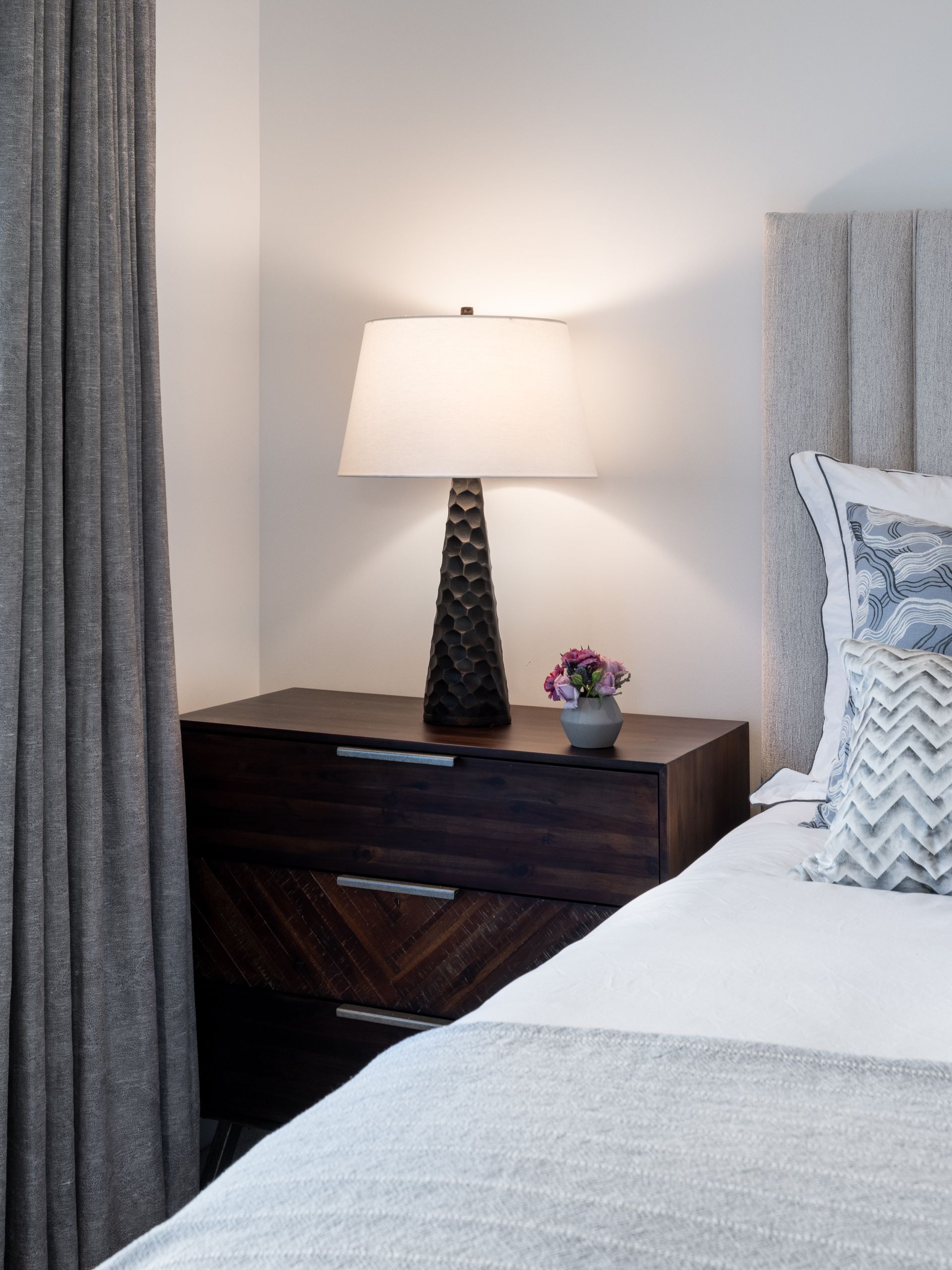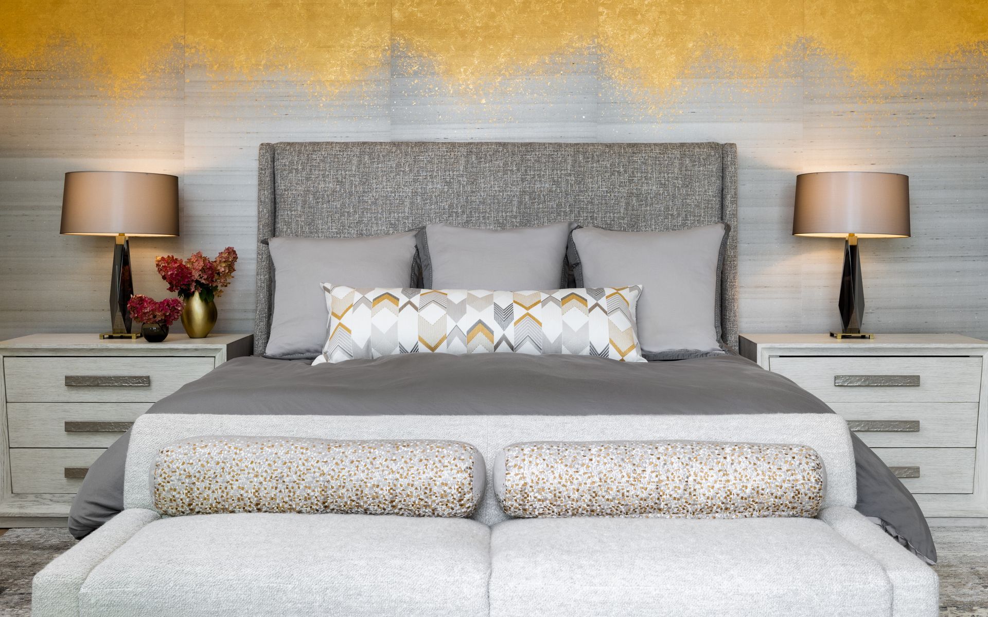 Offering a destination of retreat, this primary bedroom is a place of peace and rest with a regal statement that elevates the curated calming materials. The delicate necklace-like light fixture compliments the gold wallcovering offering an elegant reflection of the clients while the lightness and plushness of the fabrics enhance the room’s ambiance of relaxation. The extra-large chair and footboard sofa encourage easy conversation and lounging opportunities for a night in. The Primary Bath is an extension of the Primary Bedroom that demonstrates its own elegance with high-end tile and stone finishes, uniquely shaped lighting, and a luxurious bathing opportunity framed by the view.