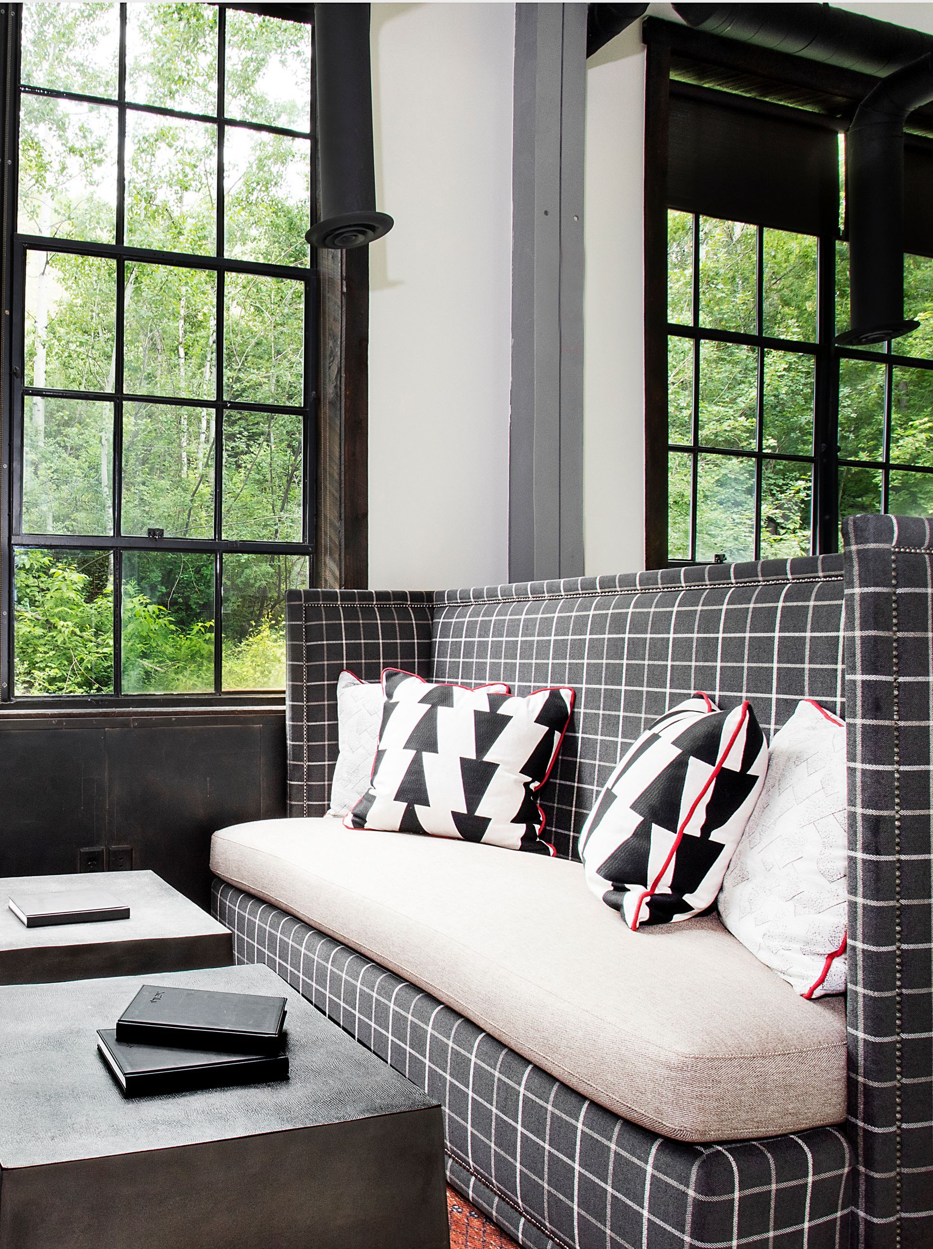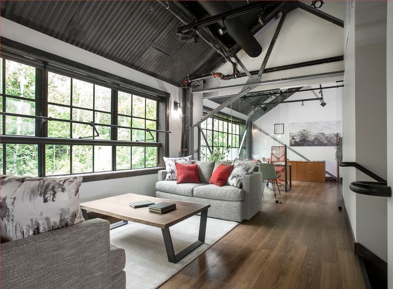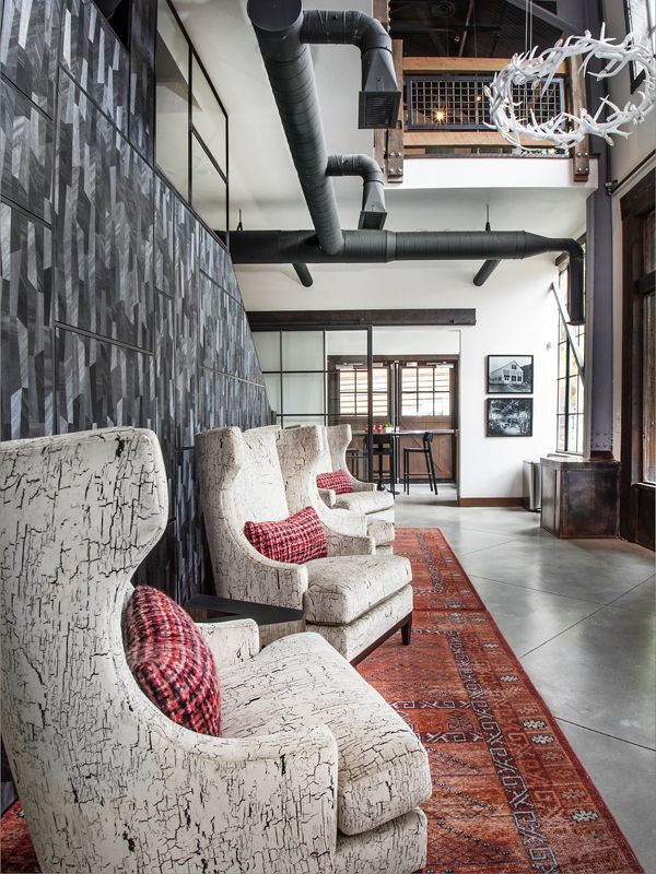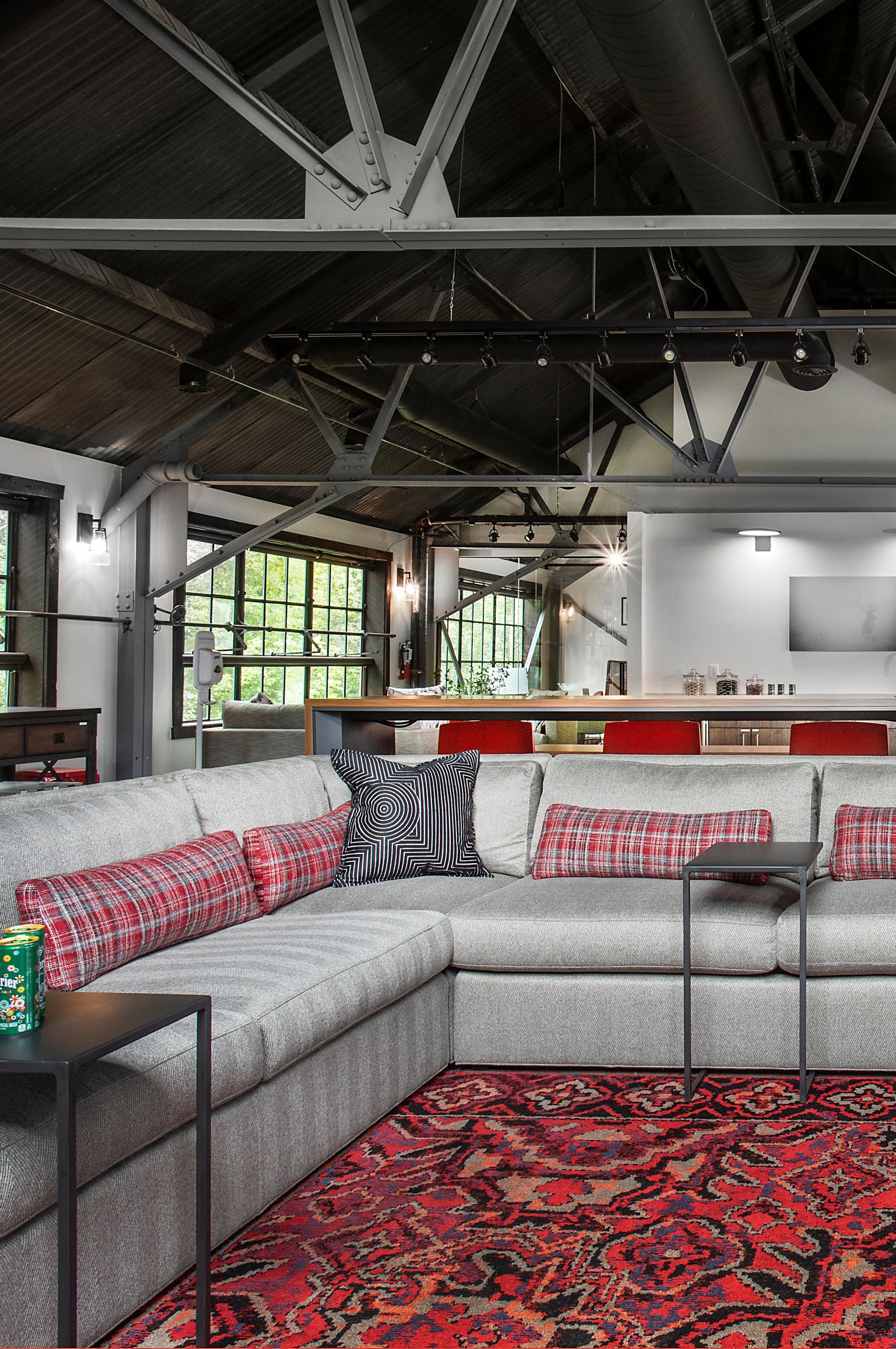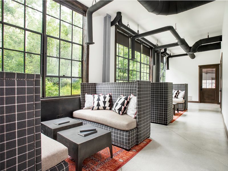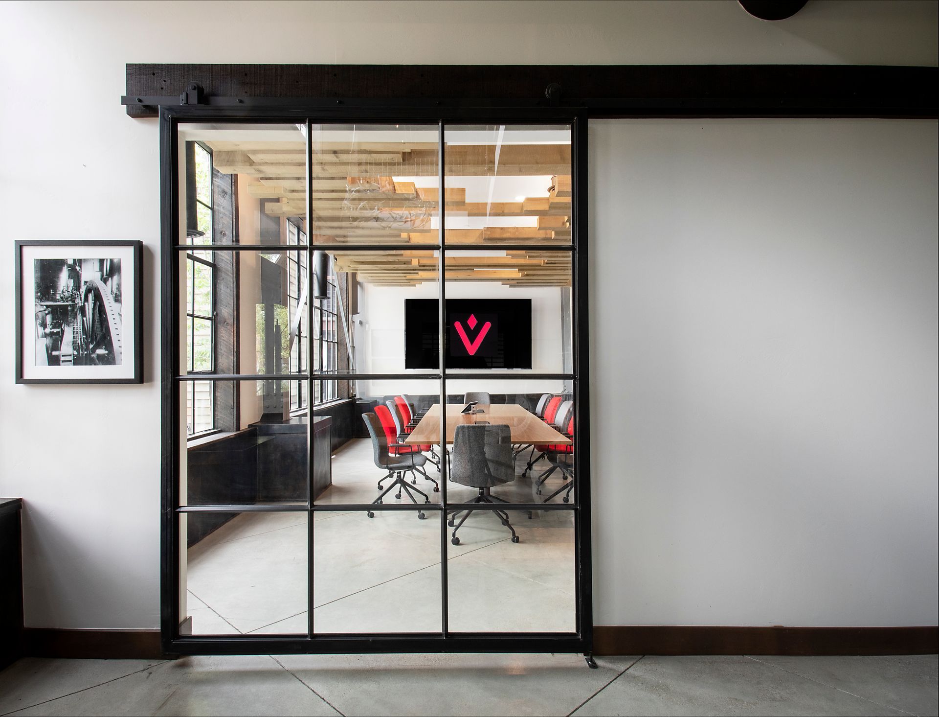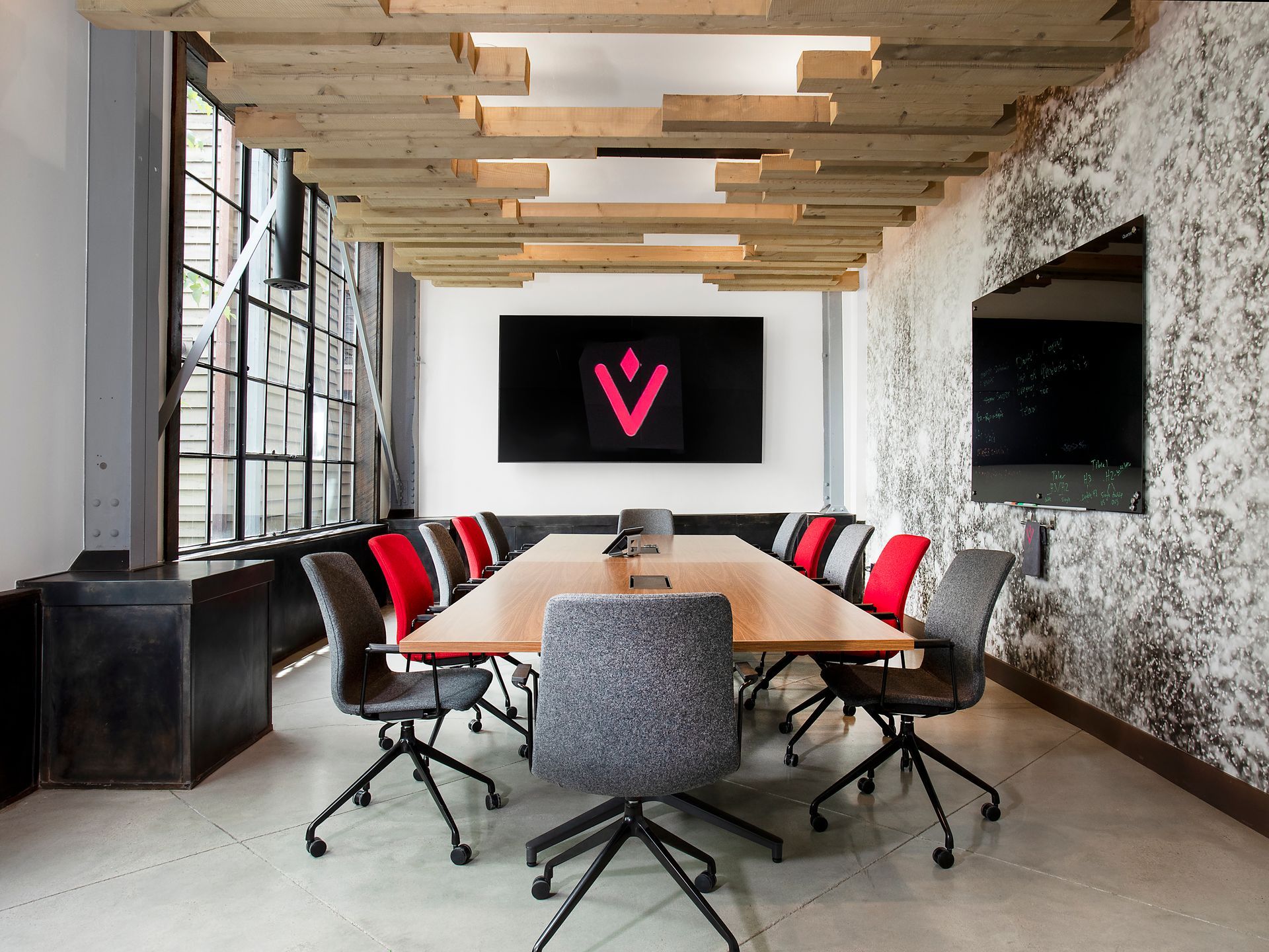 High end Herman Miller task furniture provides function for a professional conference space carrying the company’s brand into a living environment. Wallpaper softens the space while a unique wood beam sculpture breaks the ceiling plane creating energy and connecting the space to the surrounding natural environment.