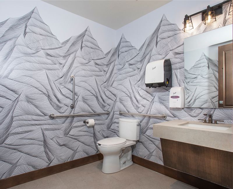 The K. Rocke Design team worked with local artist Havoc Hendriks to create this custom mountain wallpaper to create a statement for this business bathroom.