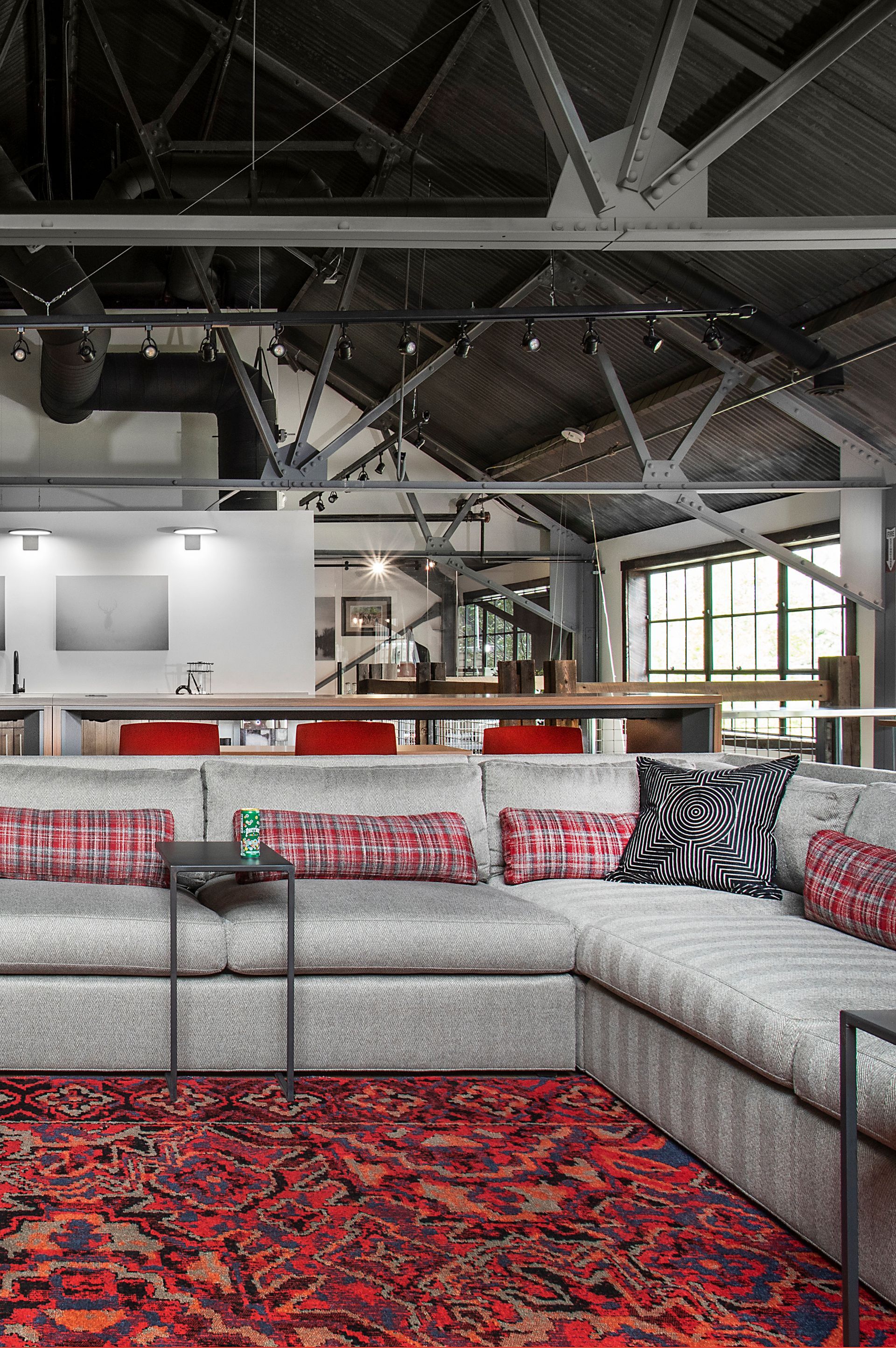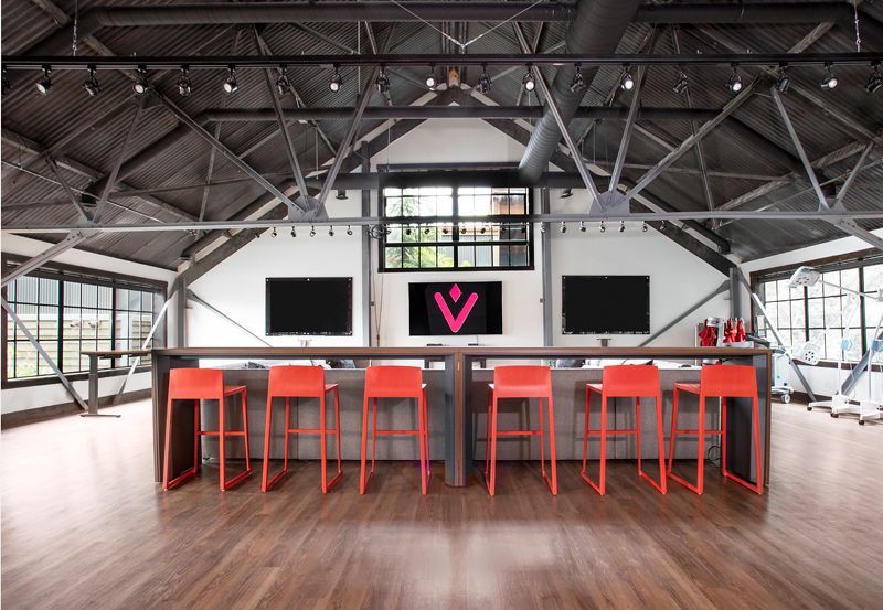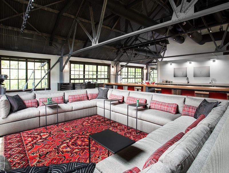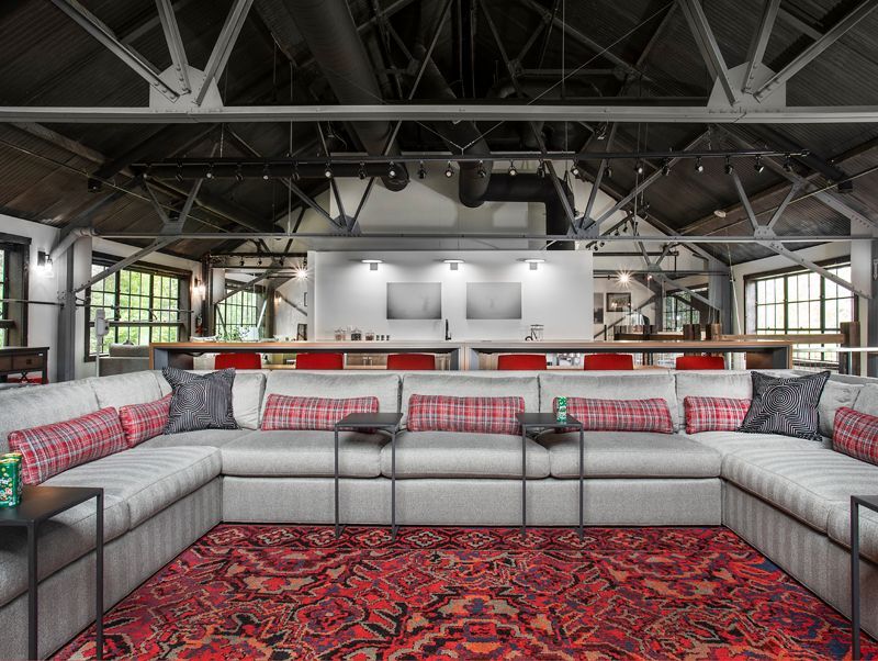 A comfortable presentation and gathering space offers large meetings intimacy and ease of versatility. Mobile sofa tables provide guests laptop stations while bar seating behind offers space for a more entertaining and engagement vantage point of the meeting.